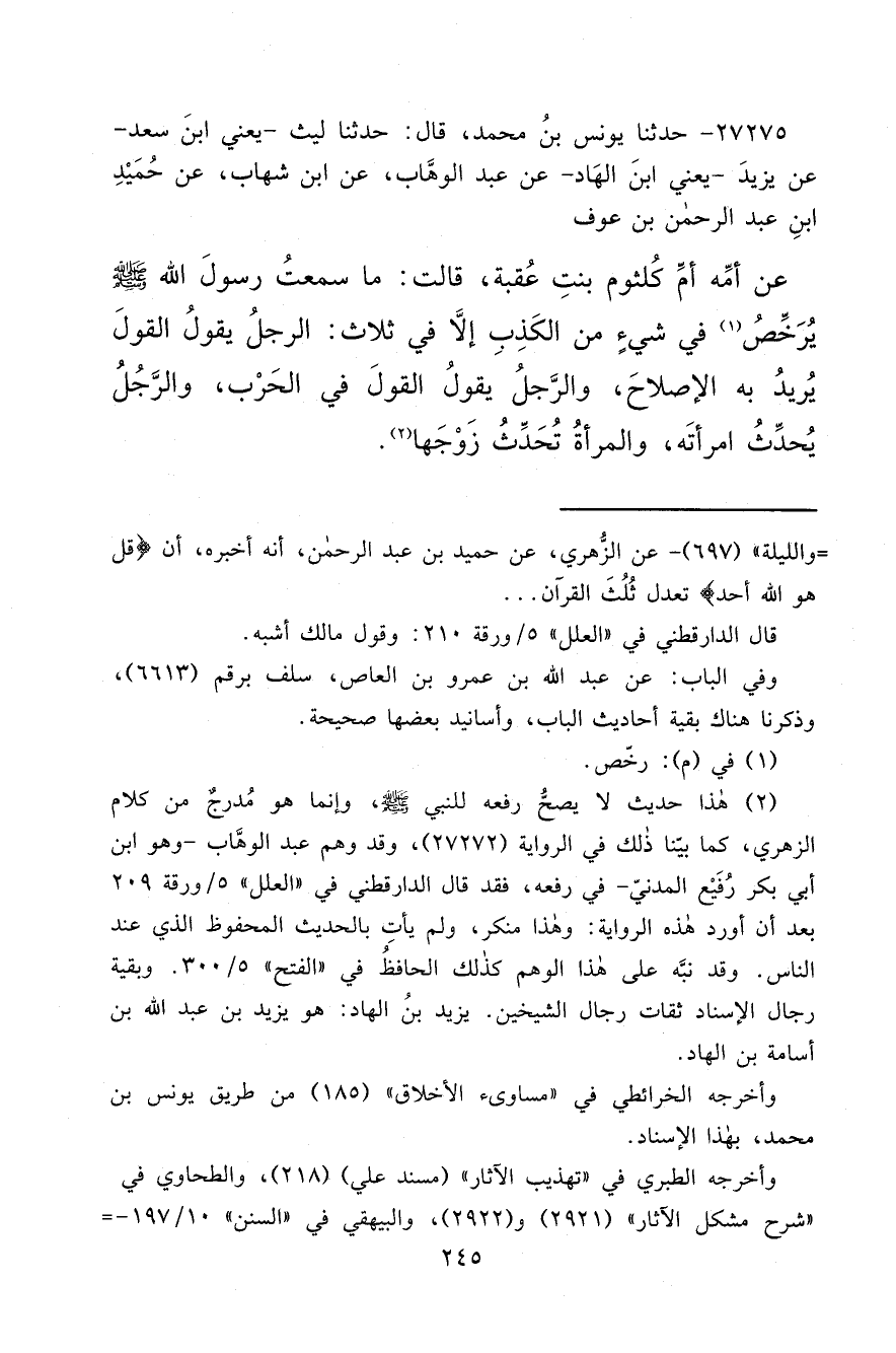 ٢٧٢٧٥ - حَدَّثَنَا يُونُسُ بْنُ مُحَمَّدٍ، قَالَ: حَدَّثَنَا لَيْثٌ يَعْنِي ابْنَ سَعْدٍ، عَنْ يَزِيدَ يَعْنِي ابْنَ الْهَادِ، عَنْ عَبْدِ الْوَهَّابِ، عَنِ ابْنِ شِهَابٍ، عَنْ حُمَيْدِ بْنِ عَبْدِ الرَّحْمَنِ بْنِ عَوْفٍ، عَنْ أُمِّهِ أُمِّ كُلْثُومٍ بِنْتِ عُقْبَةَ قَالَتْ: " مَا سَمِعْتُ رَسُولَ اللهِ صَلَّى اللهُ عَلَيْهِ وَسَلَّمَ يُرَخَّصُ (١) فِي شَيْءٍ مِنَ الْكَذِبِ إِلَّا فِي ثَلَاثٍ: الرَّجُلِ يَقُولُ الْقَوْلَ يُرِيدُ بِهِ الْإِصْلَاحَ، وَالرَّجُلِ يَقُولُ الْقَوْلَ فِي الْحَرْبِ، وَالرَّجُلِ يُحَدِّثُ امْرَأَتَهُ، وَالْمَرْأَةِ تُحَدِّثُ زَوْجَهَا " (٢)