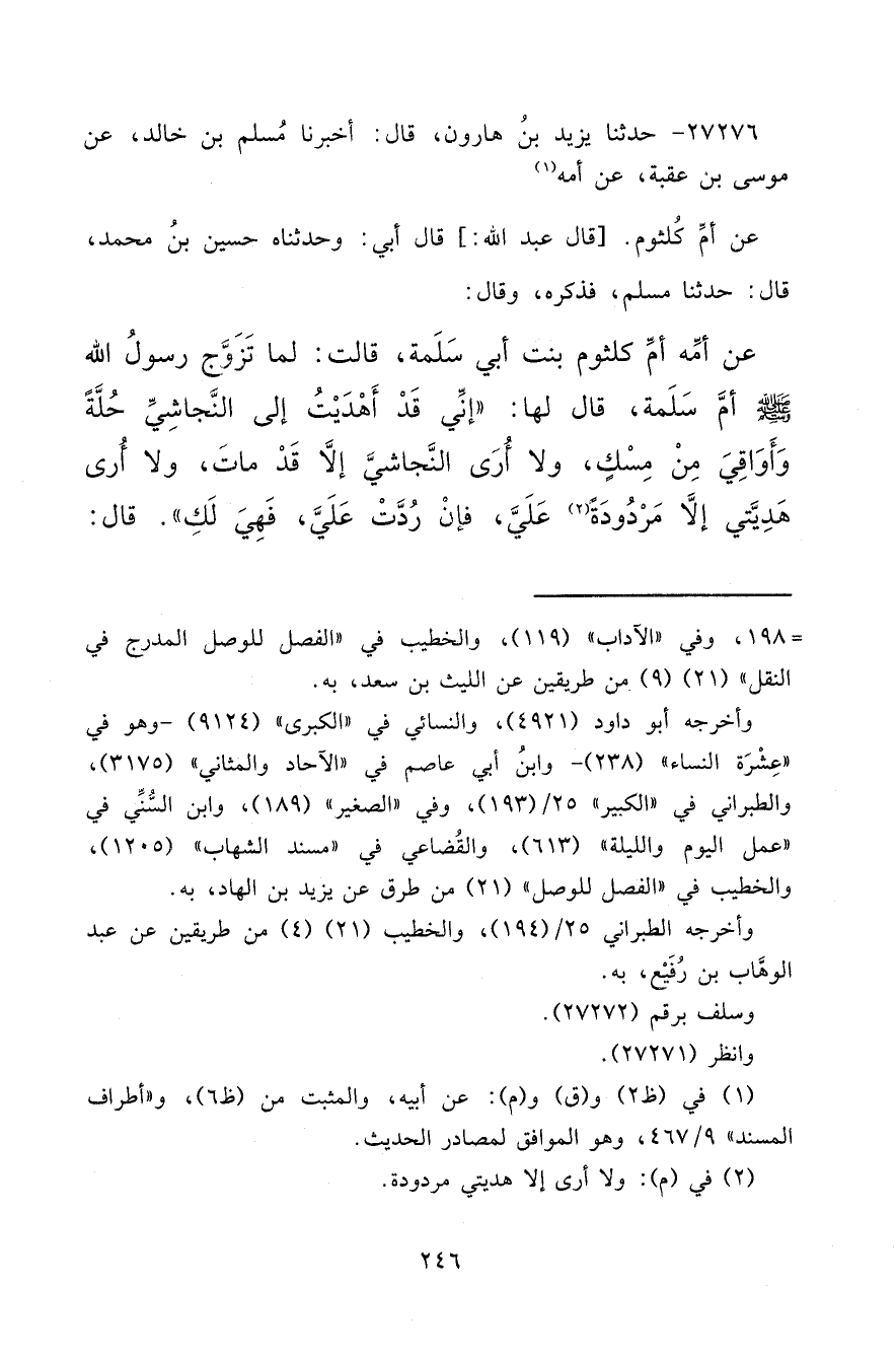 ٢٧٢٧٦ - حَدَّثَنَا يَزِيدُ بْنُ هَارُونَ، قَالَ: أَخْبَرَنَا مُسْلِمُ بْنُ خَالِدٍ، عَنْ مُوسَى بْنِ عُقْبَةَ، عَنْ أُمِّهِ (١) عَنْ أُمِّ كُلْثُومٍ [قَالَ عَبْدُ اللهِ:] قَالَ أَبِي: وحَدَّثَنَاهُ حُسَيْنُ بْنُ مُحَمَّدٍ، قَالَ: حَدَّثَنَا مُسْلِمٌ، فَذَكَرَهُ وَقَالَ: عَنْ أُمِّهِ أُمِّ كُلْثُومٍ بِنْتِ أَبِي سَلَمَةَ قَالَتْ: لَمَّا تَزَوَّجَ رَسُولُ اللهِ صَلَّى اللهُ عَلَيْهِ وَسَلَّمَ أُمَّ سَلَمَةَ قَالَ لَهَا: " إِنِّي قَدْ أَهْدَيْتُ إِلَى النَّجَاشِيِّ حُلَّةً وَأَوَاقِيَّ مِنْ مِسْكٍ، وَلَا أَرَى النَّجَاشِيَّ إِلَّا قَدْ مَاتَ، وَلَا أَرَى إِلَّا هَدِيَّتِي مَرْدُودَةً (٢) عَلَيَّ، فَإِنْ رُدَّتْ عَلَيَّ فَهِيَ لَكِ "، قَالَ: