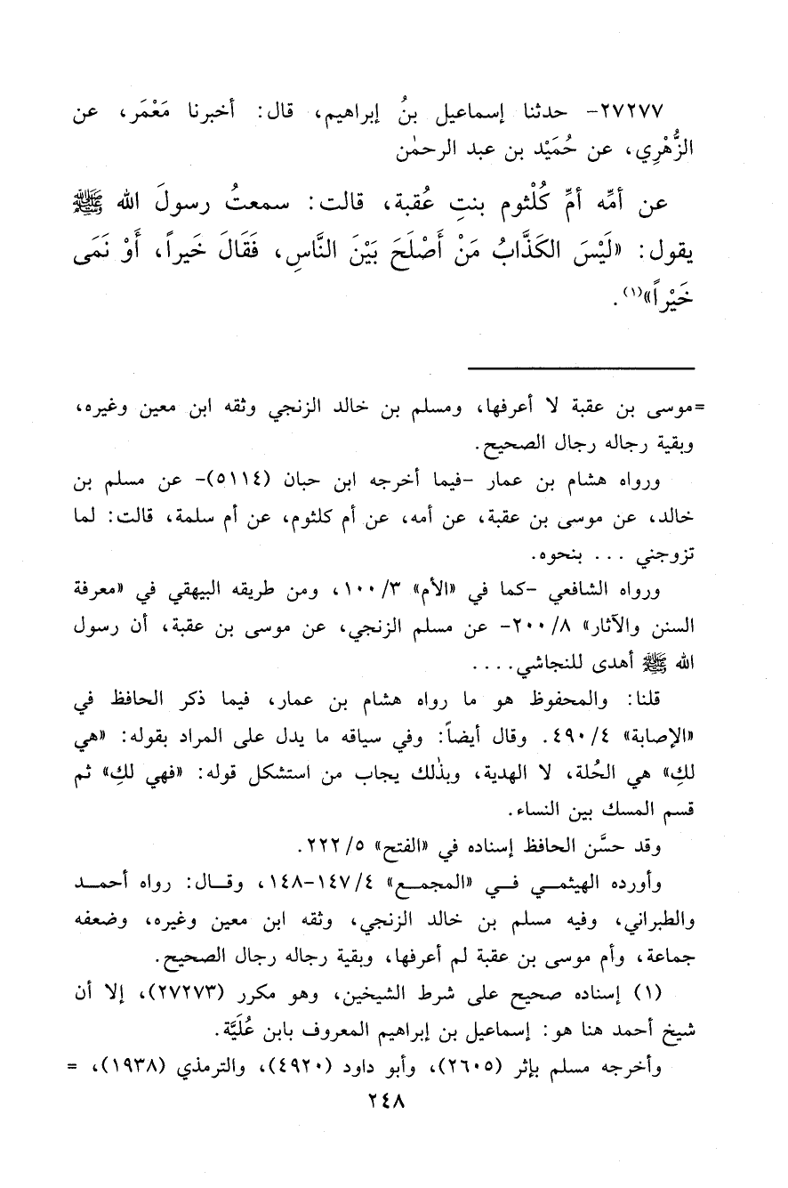 ٢٧٢٧٧ - حَدَّثَنَا إِسْمَاعِيلُ بْنُ إِبْرَاهِيمَ، قَالَ: أَخْبَرَنَا مَعْمَرٌ، عَنِ الزُّهْرِيِّ، عَنْ حُمَيْدِ بْنِ عَبْدِ الرَّحْمَنِ، عَنْ أُمِّهِ أُمِّ كُلْثُومٍ بِنْتِ عُقْبَةَ قَالَتْ: سَمِعْتُ رَسُولَ اللهِ صَلَّى اللهُ عَلَيْهِ وَسَلَّمَ يَقُولُ: " لَيْسَ الْكَذَّابُ مَنْ أَصْلَحَ بَيْنَ النَّاسِ فَقَالَ خَيْرًا أَوْ نَمَى خَيْرًا " (١)