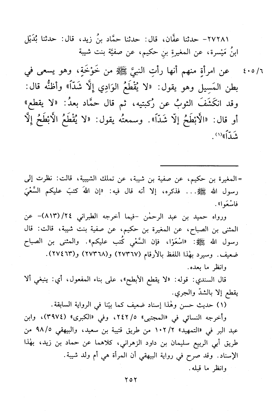 ٢٧٢٨١ - حَدَّثَنَا عَفَّانُ، قَالَ: حَدَّثَنَا حَمَّادُ بْنُ زَيْدٍ، قَالَ: حَدَّثَنَا بُدَيْلُ بْنُ مَيْسَرَةَ، عَنِ الْمُغِيرَةِ بْنِ حَكِيمٍ، عَنْ صَفِيَّةَ بِنْتِ شَيْبَةَ، عَنِ امْرَأَةٍ مِنْهُمْ، أَنَّهَا رَأَتِ النَّبِيَّ صَلَّى اللهُ عَلَيْهِ وَسَلَّمَ مِنْ خَوْخَةٍ وَهُوَ يَسْعَى فِي بَطْنِ الْمَسِيلِ وَهُوَ يَقُولُ: " لَا يُقْطَعُ الْوَادِي إِلَّا شَدًّا "، وَأَظُنُّهُ قَالَ: وَقَدْ انْكَشَفَ الثَّوْبُ عَنْ رُكْبَتَيْهِ، ثُمَّ قَالَ حَمَّادٌ بَعْدُ: " لَا يُقْطَعُ "، أَوْ قَالَ: " الْأَبْطَحُ إِلَّا شَدًّا "، وَسَمِعَتْهُ يَقُولُ: " لَا يُقْطَعُ الْأَبْطَحُ إِلَّا شَدًّا " (١)