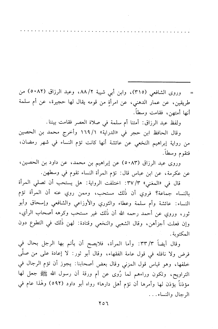 = وروى الشافعي (٣١٥) ، وابن أبي شيبة ٢/٨٨، وعبد الرزاق (٥٠٨٢) من طريقين، عن عمار الدهني، عن امرأةٍ من قومه يقال لها حجيرة، عن أم سلمة أنها أمتهن، فقامت وسطاً.