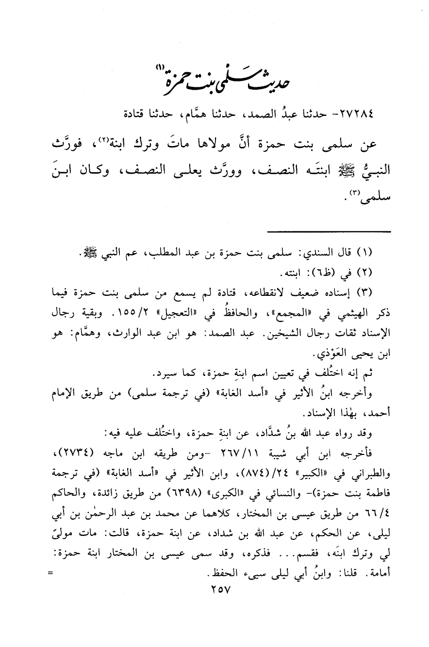 ٢٧٢٨٤ - حَدَّثَنَا عَبْدُ الصَّمَدِ، حَدَّثَنَا هَمَّامٌ، حَدَّثَنَا قَتَادَةُ، عَنْ سَلْمَى بِنْتِ حَمْزَةَ، " أَنَّ مَوْلَاهَا مَاتَ وَتَرَكَ ابْنَةً (٢) فَوَرَّثَ النَّبِيُّ صَلَّى اللهُ عَلَيْهِ وَسَلَّمَ ابْنَتَهُ النِّصْفَ، وَوَرَّثَ يَعْلَى النِّصْفَ "، وَكَانَ ابْنَ سَلْمَى (٣)