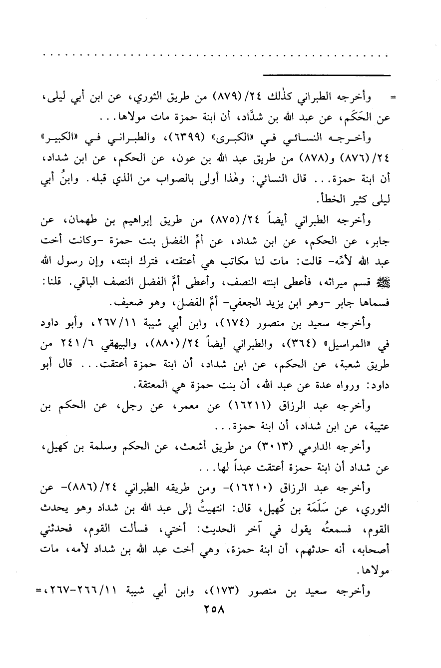 وأخرجه الطبراني أيضاً ٢٤/ (٨٧٥) من طريق إبراهيم بن طهمان، عن جابر، عن الحكم، عن ابن شداد، عن أمِّ الفضل بنت حمزة -وكانت أخت عبد الله لأمِّه- قالت: مات لنا مكاتب هي أعتقته، فترك ابنته، وإن رسول الله صَلَّى اللهُ عَلَيْهِ وَسَلَّمَ قسم ميراثه، فأعطى ابنته النصف، وأعطى أمِّ الفضل النصف الباقي. قلنا: فسماها جابر -وهو ابن يزيد الجعفي- أمِّ الفضل، وهو ضعيف.