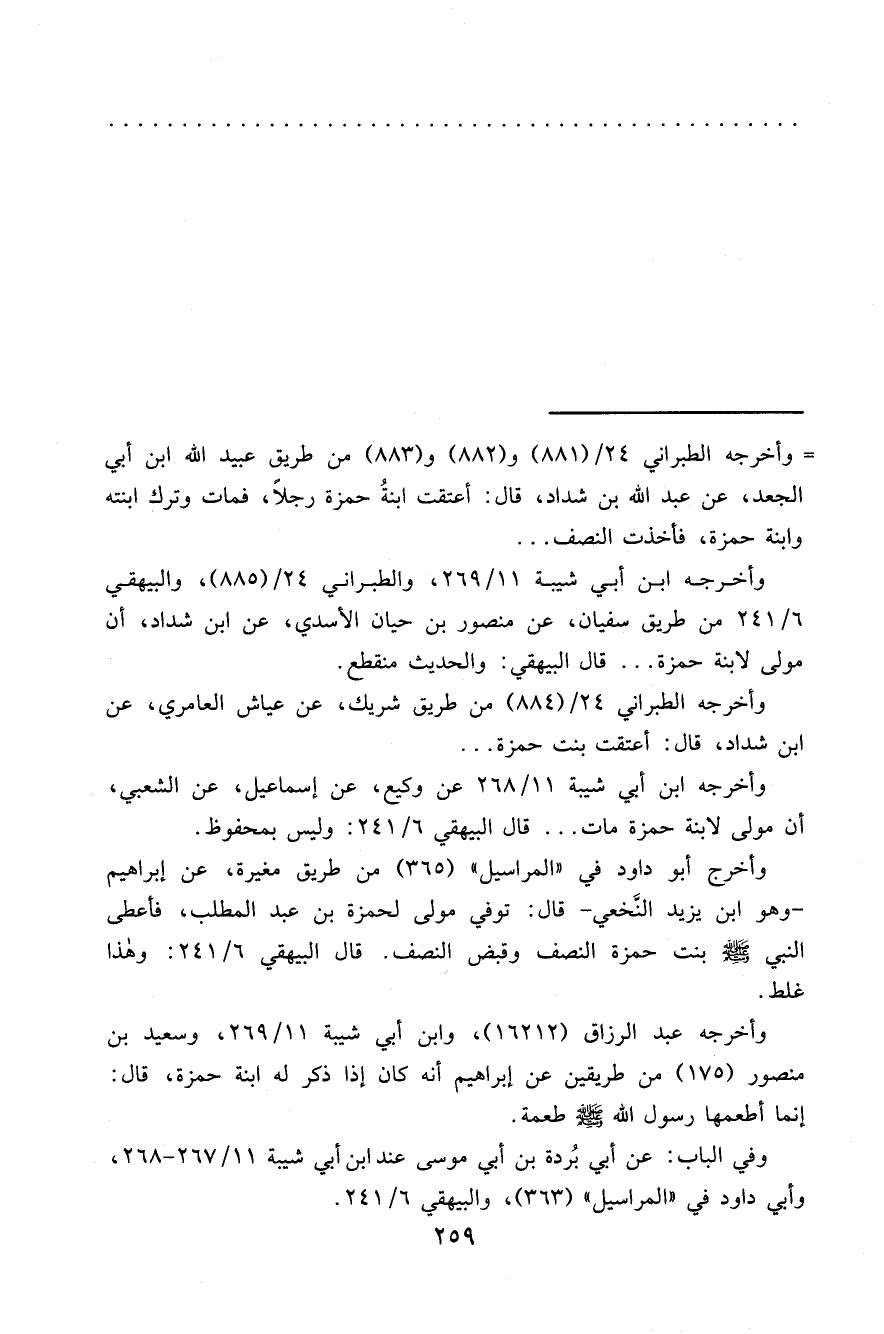 = وأخرجه الطبراني ٢٤/ (٨٨١) و (٨٨٢) و (٨٨٣) من طريق عبيد الله ابن أبي الجعد، عن عبد الله بن شداد، قال: أعتقت ابنةُ حمزة رجلاً، فمات وترك ابنته وابنة حمزة، فأخذت النصف ...