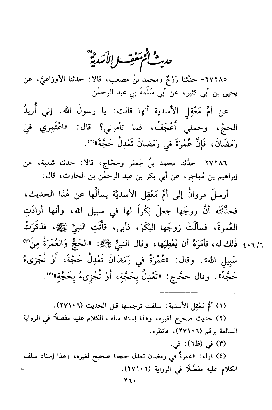 ٢٧٢٨٥ - حَدَّثَنَا رَوْحٌ، وَمُحَمَّدُ بْنُ مُصْعَبٍ، قَالَا: حَدَّثَنَا الْأَوْزَاعِيُّ، عَنْ يَحْيَى بْنِ أَبِي كَثِيرٍ، عَنْ أَبِي سَلَمَةَ بْنِ عَبْدِ الرَّحْمَنِ، عَنْ أُمِّ مَعْقِلٍ الْأَسَدِيَّةِ أَنَّهَا قَالَتْ: يَا رَسُولَ اللهِ، إِنِّي أُرِيدُ الْحَجَّ، وَجَمَلِي أَعْجَفُ، فَمَا تَأْمُرُنِي؟ قَالَ: " اعْتَمِرِي فِي رَمَضَانَ، فَإِنَّ عُمْرَةً فِي رَمَضَانَ تَعْدِلُ حَجَّةً " (٢)