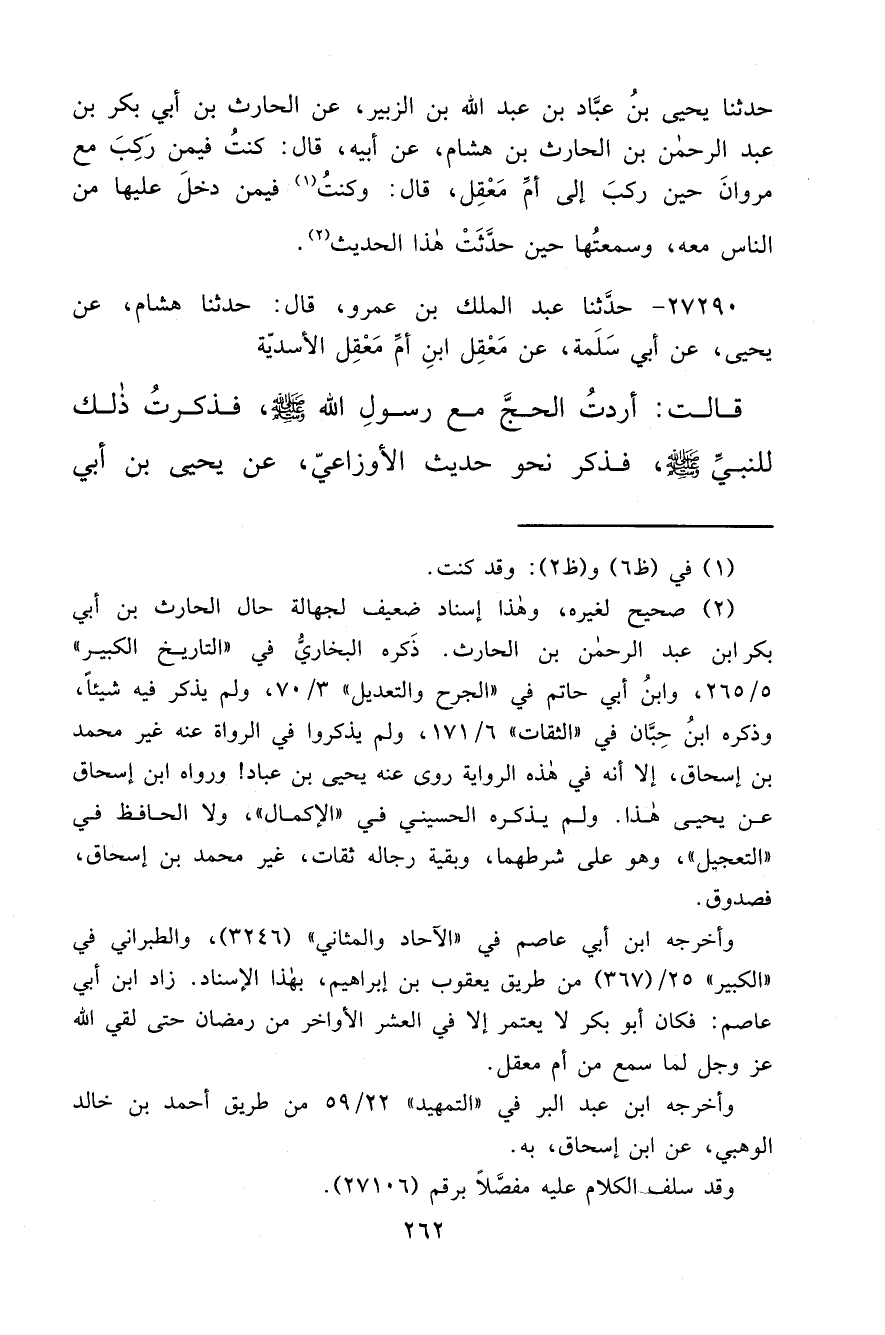 ٢٧٢٩٠ - حَدَّثَنَا عَبْدُ الْمَلِكِ بْنُ عَمْرٍو، قَالَ: حَدَّثَنَا هِشَامٌ، عَنْ يَحْيَى، عَنْ أَبِي سَلَمَةَ، عَنْ مَعْقِلِ بْنِ أُمِّ مَعْقِلٍ الأَسَدِيَّةِ، قَالَتْ: أَرَدْتُ الْحَجَّ مَعَ رَسُولِ اللهِ صَلَّى اللهُ عَلَيْهِ وَسَلَّمَ فَذَكَرْتُ ذَلِكَ لِلنَّبِيِّ صَلَّى اللهُ عَلَيْهِ وَسَلَّمَ، فَذَكَرَ نَحْوَ حَدِيثِ الْأَوْزَاعِيِّ، عَنْ يَحْيَى بْنِ أَبِي