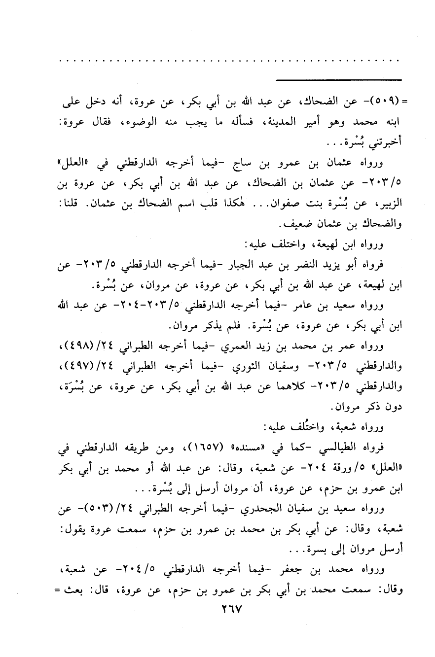 ورواه سعيد بن عامر -فيما أخرجه الدارقطني ٥/٢٠٣-٢٠٤- عن عبد الله ابن أبي بكر، عن عروة، عن بُسْرة. فلم يذكر مروان.