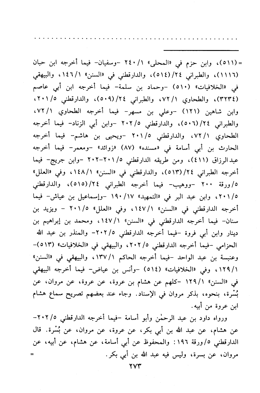 ورواه داود بن عبد الرحمن وأبو أسامة -فيما أخرجه الدارقطني ٥/٢٠٢- عن هشام، عن عبد الله بن أبي بكر، عن عروة، عن مروان، عن بُسْرة. قال الدارقطني ٥/ورقة ١٩٦: والمحفوظ عن أبي أسامة، عن هشام، عن أبيه، عن مروان، عن بسرة، وليس فيه عبد الله بن أبي بكر. =