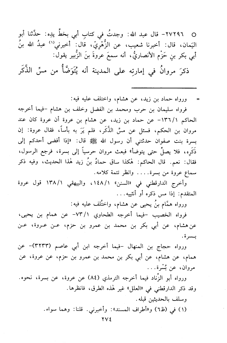 ° ٢٧٢٩٦ - قَالَ عَبْدُ اللهِ: وَجَدْتُ فِي كِتَابِ أَبِي بِخَطِّ يَدِهِ، حَدَّثَنَا أَبُو الْيَمَانِ، قَالَ: أَخْبَرَنَا شُعَيْبٌ، عَنِ الزُّهْرِيِّ قَالَ: أَخْبَرَنِي (١) عَبْدُ اللهِ بْنُ أَبِي بَكْرِ بْنِ حَزْمٍ الْأَنْصَارِيُّ، أَنَّهُ سَمِعَ عُرْوَةَ بْنَ الزُّبَيْرِ يَقُولُ: ذَكَرَ مَرْوَانُ فِي إِمَارَتِهِ عَلَى الْمَدِينَةِ أَنَّهُ يُتَوَضَّأُ مِنْ مَسِّ الذَّكَرِ