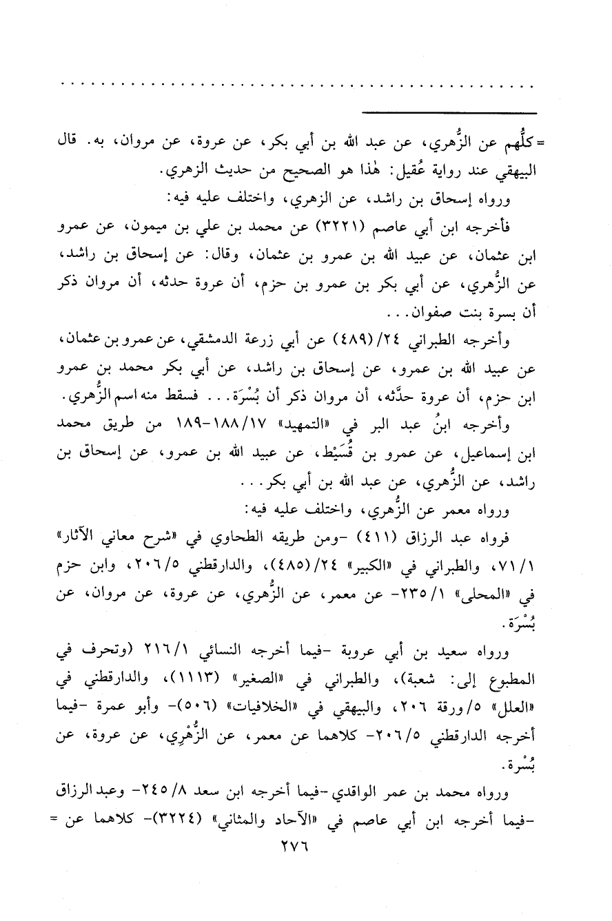 وأخرجه الطبراني ٢٤/ (٤٨٩) عن أبي زرعة الدمشقي، عن عمرو بن عثمان، عن عبيد الله بن عمرو، عن إسحاق بن راشد، عن أبي بكر محمد بن عمرو ابن حزم، أن عروة حدَّثه، أن مروان ذكر أن بُسْرَة ... فسقط منه اسم الزُّهري.