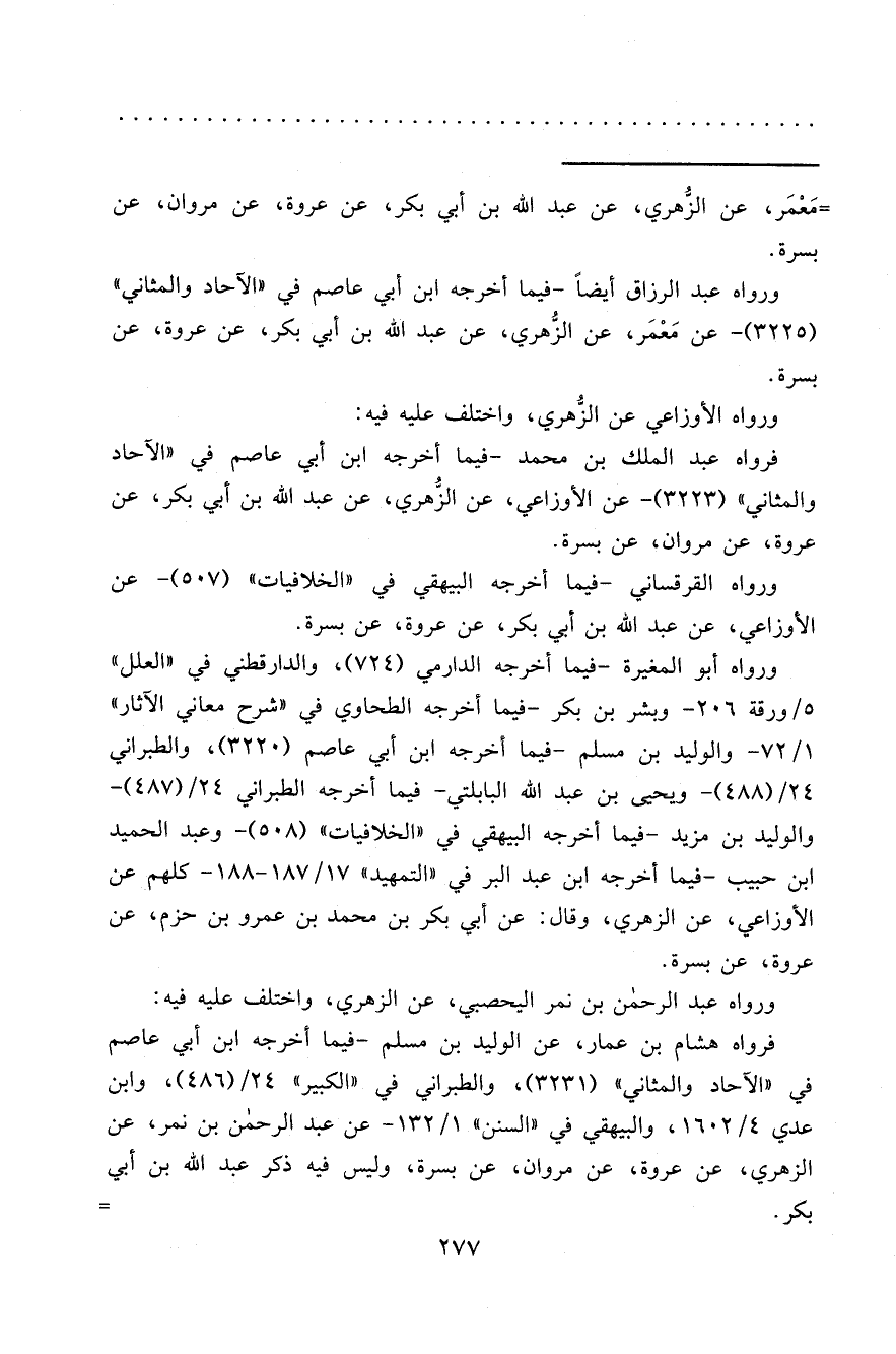 فرواه هشام بن عمار، عن الوليد بن مسلم -فيما أخرجه ابن أبي عاصم في "الآحاد والمثاني" (٣٢٣١) ، والطبراني في "الكبير" ٢٤/ (٤٨٦) ، وابن عدي ٤/١٦٠٢، والبيهقي في "السنن" ١/١٣٢- عن عبد الرحمن بن نمر، عن الزهري، عن عروة، عن مروان، عن بسرة، وليس فيه ذكر عبد الله بن أبي بكر. =