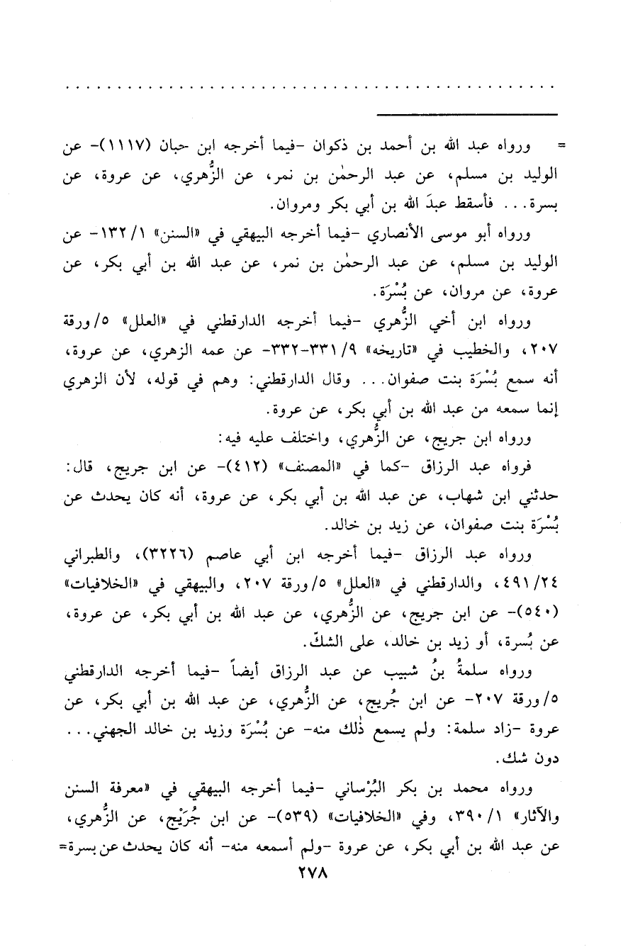 = ورواه عبد الله بن أحمد بن ذكوان -فيما أخرجه ابن حبان (١١١٧) - عن الوليد بن مسلم، عن عبد الرحمن بن نمر، عن الزُّهري، عن عروة، عن بسوة ... فأسقط عبدَ الله بن أبي بكر ومروان.