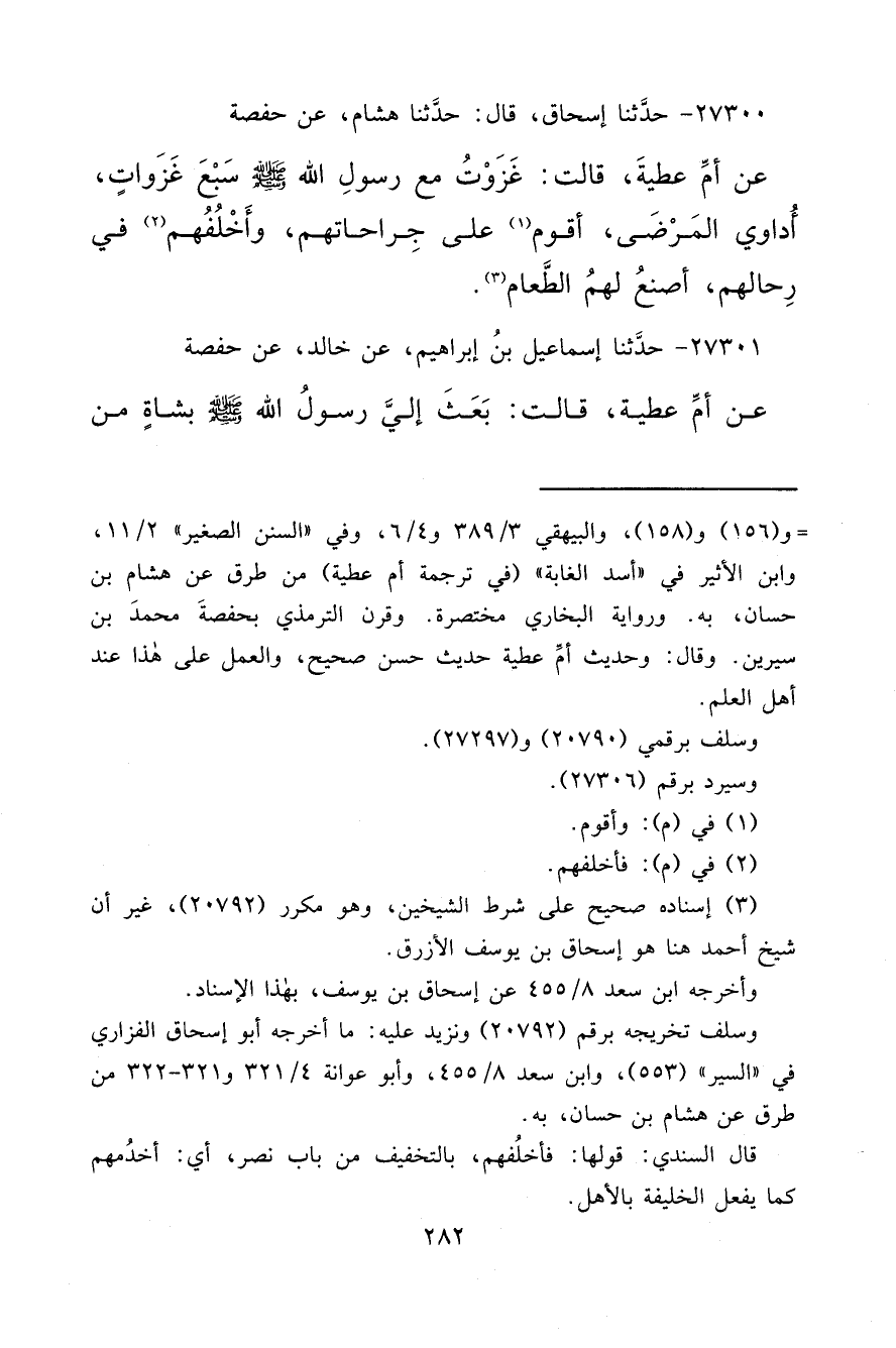 ٢٧٣٠٠ - حَدَّثَنَا إِسْحَاقُ، قَالَ: حَدَّثَنَا هِشَامٌ، عَنْ حَفْصَةَ، عَنْ أُمِّ عَطِيَّةَ قَالَتْ: " غَزَوْتُ مَعَ رَسُولِ اللهِ صَلَّى اللهُ عَلَيْهِ وَسَلَّمَ سَبْعَ غَزَوَاتٍ أُدَاوِي الْمَرْضَى، وَأَقُومُ (١) عَلَى جِرَاحَاتِهِمْ، وَأَخْلُفُهُمْ (٢) فِي رِحَالِهِمْ أَصْنَعُ لَهُمُ الطَّعَامَ " (٣)