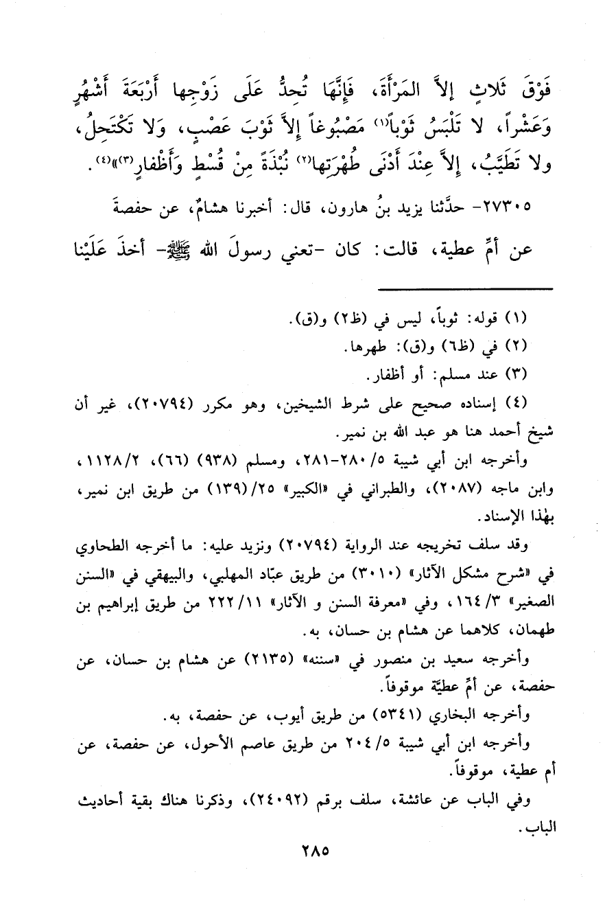 فَوْقَ ثَلَاثٍ، إِلَّا الْمَرْأَةُ فَإِنَّهَا تُحِدُّ عَلَى زَوْجِهَا أَرْبَعَةَ أَشْهُرٍ وَعَشْرًا، لَا تَلْبَسُ ثَوْبًا (١) مَصْبُوغًا إِلَّا ثَوْبَ عَصْبٍ، وَلَا تَكْتَحِلُ، وَلَا تَطَّيَّبُ إِلَّا عِنْدَ أَدْنَى طُهْرَتِهَا (٢) نُبْذَةً مِنْ قُسْطٍ وَأَظْفَارٍ (٣) " (٤)