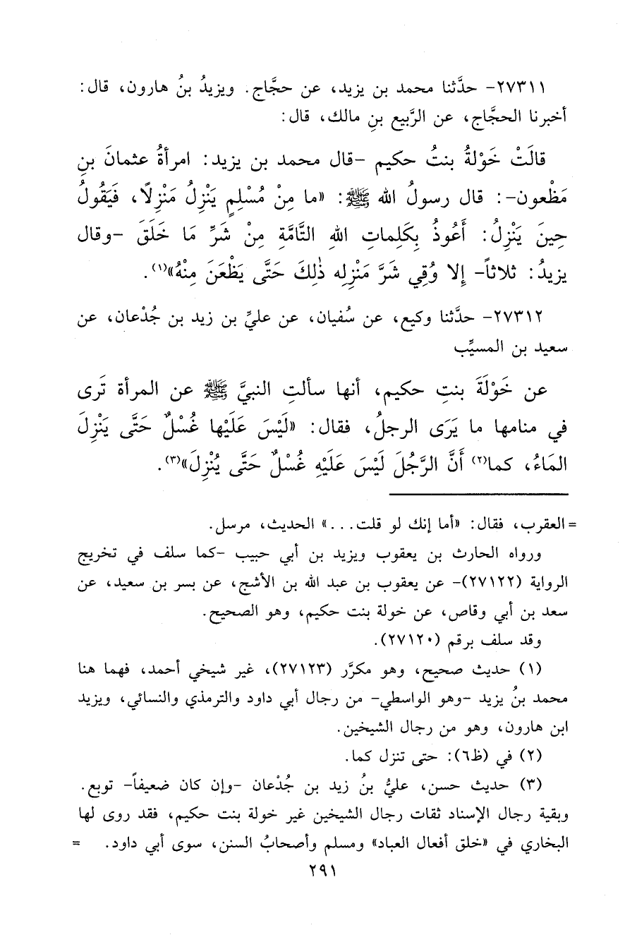 ٢٧٣١١ - حَدَّثَنَا مُحَمَّدُ بْنُ يَزِيدَ، عَنْ حَجَّاجٍ، وَيَزِيدُ بْنُ هَارُونَ قَالَ: أَخْبَرَنَا الْحَجَّاجُ، عَنِ الرَّبِيعِ بْنِ مَالِكٍ قَالَ: قَالَتْ خَوْلَةُ بِنْتُ حَكِيمٍ ـ قَالَ مُحَمَّدُ بْنُ يَزِيدَ: امْرَأَةُ عُثْمَانَ بْنِ مَظْعُونٍ ـ قَالَ رَسُولُ اللهِ صَلَّى اللهُ عَلَيْهِ وَسَلَّمَ: " مَا مِنْ مُسْلِمٍ يَنْزِلُ مَنْزِلًا فَيَقُولُ حِينَ يَنْزِلُ: أَعُوذُ بِكَلِمَاتِ اللهِ التَّامَّةِ مِنْ شَرِّ مَا خَلَقَ ـ وَقَالَ يَزِيدُ: ثَلَاثًا ـ إِلَّا وُقِيَ شَرَّ مَنْزِلِهِ ذَلِكَ حَتَّى يَظْعَنَ مِنْهُ " (١)
