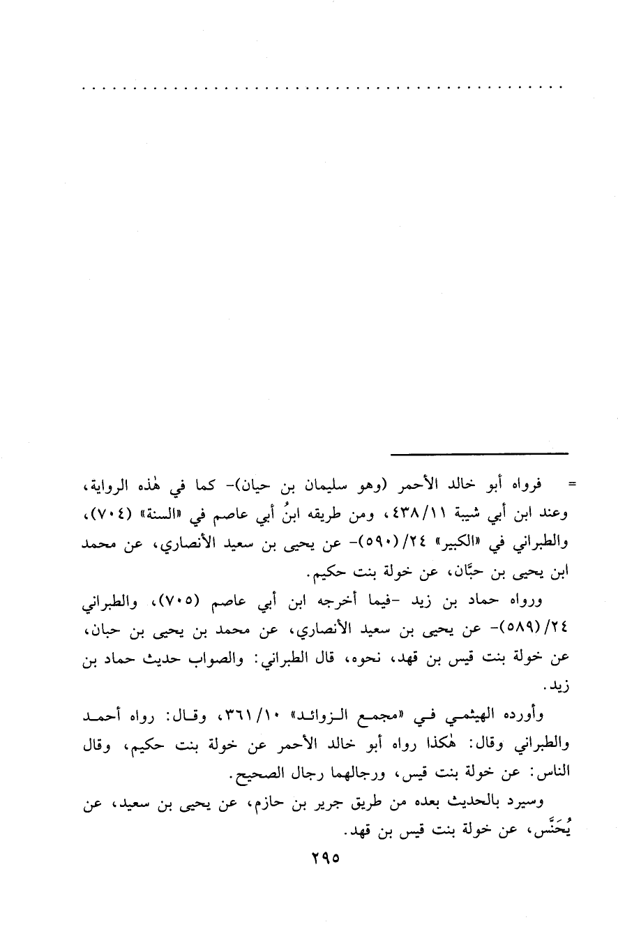 = فرواه أبو خالد الأحمر (وهو سليمان بن حيان) - كما في هذه الرواية، وعند ابن أبي شيبة ١١/٤٣٨، ومن طريقه ابن أبي عاصم في "السنة" (٧٠٤) ، والطبراني في "الكبير" ٢٤/ (٥٩٠) - عن يحيى بن سعيد الأنصاري، عن محمد ابن يحيى بن حبَّان، عن خولة بنت حكيم.