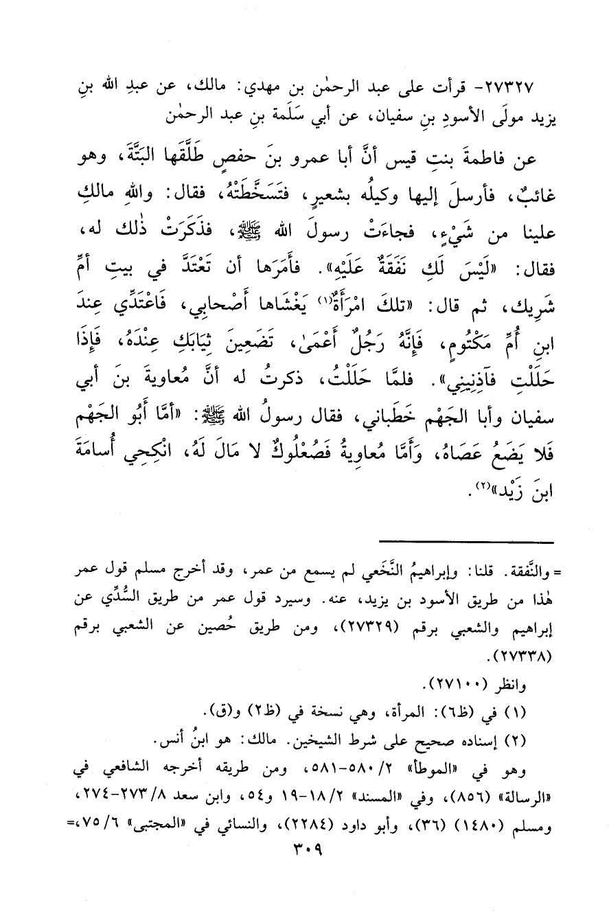 ٢٧٣٢٧ - قَرَأْتُ عَلَى عَبْدِ الرَّحْمَنِ بْنِ مَهْدِيٍّ: مَالِكٌ، عَنْ عَبْدِ اللهِ بْنِ يَزِيدَ مَوْلَى الْأَسْوَدِ بْنِ سُفْيَانَ، عَنْ أَبِي سَلَمَةَ بْنِ عَبْدِ الرَّحْمَنِ، عَنْ فَاطِمَةَ بِنْتِ قَيْسٍ، أَنَّ أَبَا عَمْرِو بْنِ حَفْصٍ طَلَّقَهَا الْبَتَّةَ وَهُوَ غَائِبٌ، فَأَرْسَلَ إِلَيْهَا وَكِيلَهُ بِشَعِيرٍ فَتَسَخَّطَتْهُ فَقَالَ: وَاللهِ مَا لَكِ عَلَيْنَا مِنْ شَيْءٍ، فَجَاءَتْ رَسُولَ اللهِ صَلَّى اللهُ عَلَيْهِ وَسَلَّمَ فَذَكَرَتْ ذَلِكَ لَهُ فَقَالَ: " لَيْسَ لَكِ نَفَقَةٌ عَلَيْهِ "، فَأَمَرَهَا أَنْ تَعْتَدَّ فِي بَيْتِ أُمِّ شَرِيكٍ، ثُمَّ قَالَ: " تِلْكَ امْرَأَةٌ (١) يَغْشَاهَا أَصْحَابِي فَاعْتَدِّي عِنْدَ ابْنِ أُمِّ مَكْتُومٍ، فَإِنَّهُ رَجُلٌ أَعْمَى، تَضَعِينَ ثِيَابَكِ عِنْدَهُ، فَإِذَا حَلَلْتِ فَآذِنِينِي "، فَلَمَّا حَلَلْتُ ذَكَرْتُ لَهُ أَنَّ مُعَاوِيَةَ بْنَ أَبِي سُفْيَانَ، وَأَبَا الْجَهْمِ خَطَبَانِي، فَقَالَ رَسُولُ اللهِ صَلَّى اللهُ عَلَيْهِ وَسَلَّمَ: " أَمَّا أَبُو الْجَهْمِ فَلَا يَضَعُ عَصَاهُ، وَأَمَّا مُعَاوِيَةُ فَصُعْلُوكٌ لَا مَالَ لَهُ، انْكِحِي أُسَامَةَ بْنَ زَيْدٍ "، (٢)