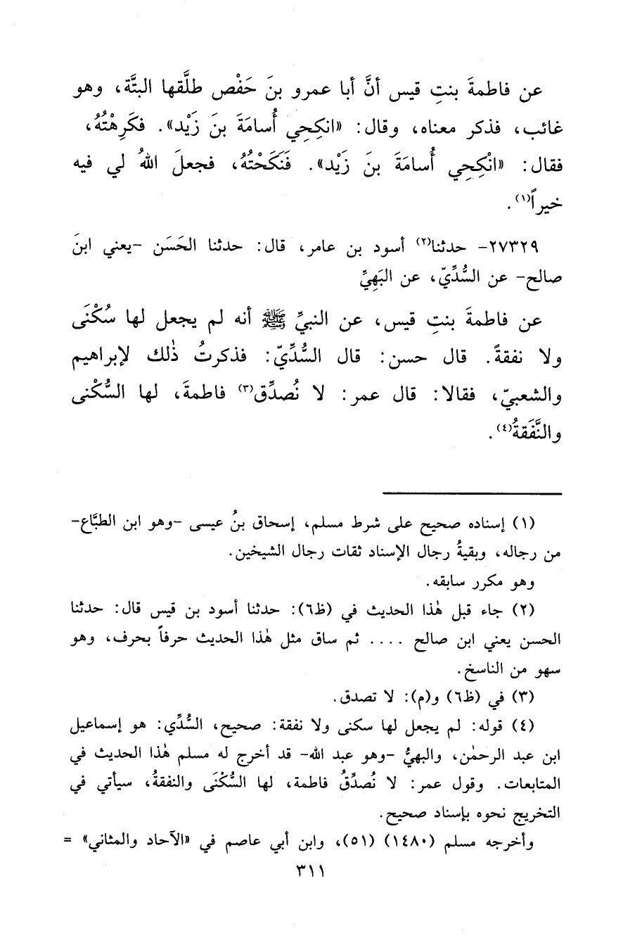 (٤) قوله: لم يجعل لها سكنى ولا نفقة: صحيح، السُدِّي: هو إسماعيل ابن عبد الرحمن، والبهيُّ- وهو عبد الله- قد أخرج له مسلم هذا الحديث في المتابعات. وقول عمر: لا نُصدِّقُ فاطمة، لها السّكْنَى والنفقةُ، سيأتي في التخريج نحوه بإسناد صحيح.