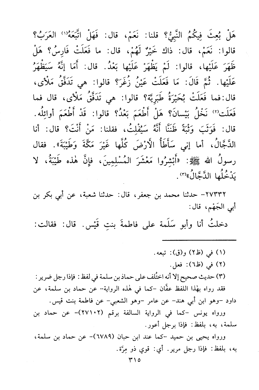 هَلْ بُعِثَ فِيكُمُ النَّبِيُّ؟ قُلْنَا: نَعَمْ، قَالَ: فَهَلْ اتَّبَعَهُ (١) الْعَرَبُ؟ قَالُوا: نَعَمْ، قَالَ: ذَاكَ خَيْرٌ لَهُمْ، قَالَ: مَا فَعَلَتْ فَارِسُ؟ هَلْ ظَهَرَ عَلَيْهَا؟ قَالُوا: لَمْ يَظْهَرْ عَلَيْهَا بَعْدُ، قَالَ: أَمَا إِنَّهُ سَيَظْهَرُ عَلَيْهَا، ثُمَّ قَالَ: مَا فَعَلَتْ عَيْنُ زُغَرَ؟ قَالُوا: هِيَ تَدْفُقُ مَلْأَى، قَالَ: فَمَا فَعَلَتْ بُحَيْرَةُ طَبَرِيَّةَ؟ قَالُوا: هِيَ تَدْفُقُ مَلْأَى، قَالَ: فَمَا فَعَلَتْ (٢) نَخْلُ بَيْسَانَ؟ هَلْ أَطْعَمَ بَعْدُ؟ قَالُوا: قَدْ أَطْعَمَ أَوَائِلُهُ، قَالَ: فَوَثَبَ وَثْبَةً ظَنَنَّا أَنَّهُ سَيَفْلِتُ، فَقُلْنَا: مَنْ أَنْتَ؟ قَالَ: أَنَا الدَّجَّالُ، أَمَا إِنِّي سَأَطَأُ الْأَرْضَ كُلَّهَا غَيْرَ مَكَّةَ وَطَيْبَةَ "، فَقَالَ رَسُولُ اللهِ صَلَّى اللهُ عَلَيْهِ وَسَلَّمَ: " أَبْشِرُوا مَعْشَرَ الْمُسْلِمِينَ، فَإِنَّ هَذِهِ طَيْبَةُ لَا يَدْخُلُهَا الدَّجَّالُ " (٣)