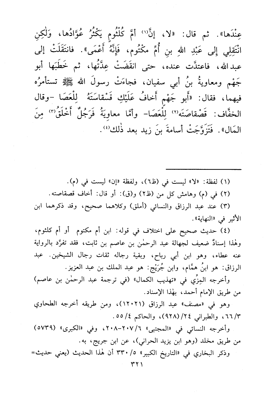 عِنْدَهَا "، ثُمَّ قَالَ: " لَا، إِنَّ (١) أُمَّ كُلْثُومٍ يَكْثُرُ عُوَّادُهَا، وَلَكِنْ انْتَقِلِي إِلَى عَبْدِ اللهِ بْنِ أُمِّ مَكْتُومٍ فَإِنَّهُ أَعْمَى "، فَانْتَقَلَتْ إِلَى عَبْدِ اللهِ فَاعْتَدَّتْ عِنْدَهُ، حَتَّى انْقَضَتْ عِدَّتُهَا، ثُمَّ خَطَبَهَا أَبُو جَهْمٍ، وَمُعَاوِيَةُ بْنُ أَبِي سُفْيَانَ، فَجَاءَتْ رَسُولَ اللهِ صَلَّى اللهُ عَلَيْهِ وَسَلَّمَ تَسْتَأْمِرُهُ فِيهِمَا، فَقَالَ: " أَبُو جَهْمٍ أَخَافُ عَلَيْكِ قَسْقَاسَتَهُ لِلْعَصَا "، - وَقَالَ: " الْخَفَّافُ قَصْقَاصَتَهُ (٢) لِلْعَصَا - وَأَمَّا مُعَاوِيَةُ فَرَجُلٌ أَخْلَقُ (٣) مِنَ الْمَالِ، فَتَزَوَّجَتْ أُسَامَةَ بْنَ زَيْدٍ بَعْدَ ذَلِكَ (٤)