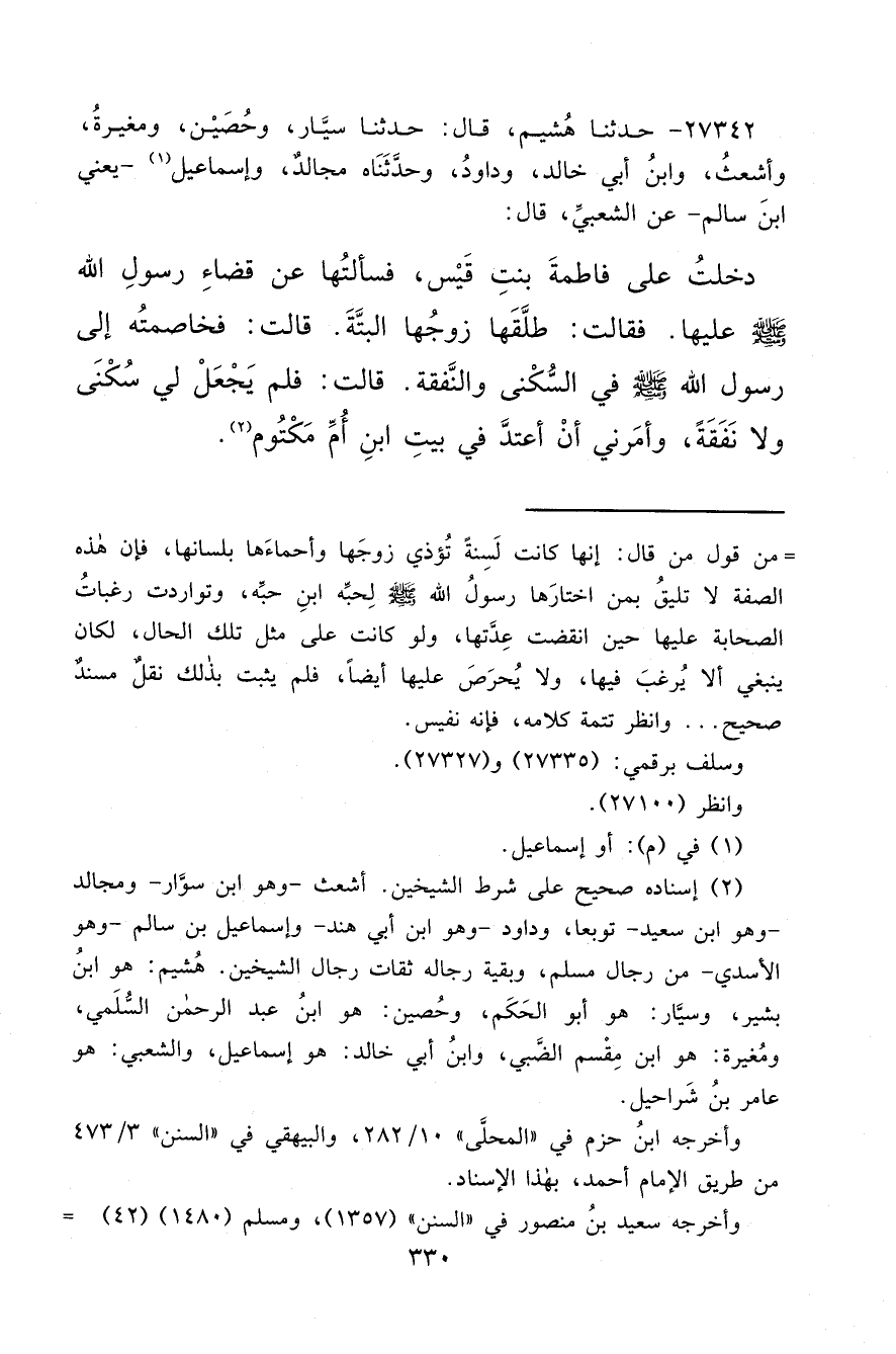 ٢٧٣٤٢ - حَدَّثَنَا هُشَيْمٌ، قَالَ: حَدَّثَنَا سَيَّارٌ، وَحُصَيْنٌ، وَمُغِيرَةُ، وَأَشْعَثُ، وَابْنُ أَبِي خَالِدٍ، وَدَاوُدُ، وَحَدَّثَنَاهُ مُجَالِدٌ، وَإِسْمَاعِيلُ (١) يَعْنِي ابْنَ سَالِمٍ، عَنِ الشَّعْبِيِّ قَالَ: دَخَلْتُ عَلَى فَاطِمَةَ بِنْتِ قَيْسٍ فَسَأَلْتُهَا عَنْ قَضَاءِ رَسُولِ اللهِ صَلَّى اللهُ عَلَيْهِ وَسَلَّمَ عَلَيْهَا، فَقَالَتْ: طَلَّقَهَا زَوْجُهَا الْبَتَّةَ، قَالَتْ: فَخَاصَمْتُهُ إِلَى رَسُولِ اللهِ صَلَّى اللهُ عَلَيْهِ وَسَلَّمَ فِي السُّكْنَى وَالنَّفَقَةِ، قَالَتْ: " فَلَمْ يَجْعَلْ لِي سُكْنَى وَلَا نَفَقَةً، وَأَمَرَنِي أَنْ أَعْتَدَّ فِي بَيْتِ ابْنِ أُمِّ مَكْتُومٍ " (٢)