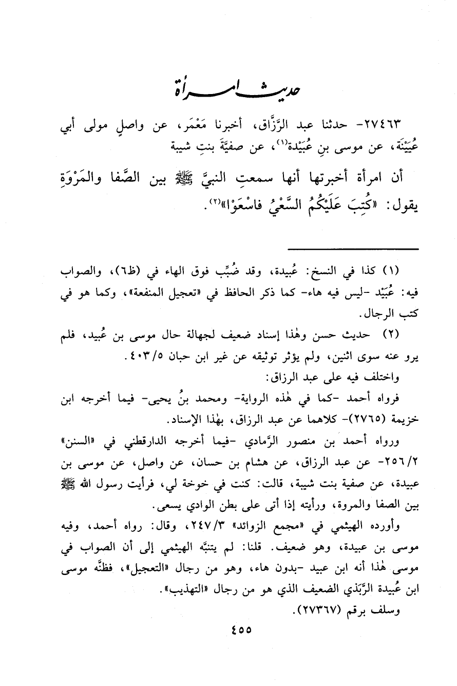 ٢٧٤٦٣ - حَدَّثَنَا عَبْدُ الرَّزَّاقِ، أَخْبَرَنَا مَعْمَرٌ، عَنْ وَاصِلٍ، مَوْلَى أَبِي عُيَيْنَةَ، عَنْ مُوسَى بْنِ عُبَيْدَةَ (١) ، عَنْ صَفِيَّةَ بِنْتِ شَيْبَةَ، أَنَّ امْرَأَةً أَخْبَرَتْهَا أَنَّهَا سَمِعَتِ النَّبِيَّ صَلَّى اللهُ عَلَيْهِ وَسَلَّمَ بَيْنَ الصَّفَا، وَالْمَرْوَةِ يَقُولُ: " كُتِبَ عَلَيْكُمُ السَّعْيُ فَاسْعَوْا " (٢)