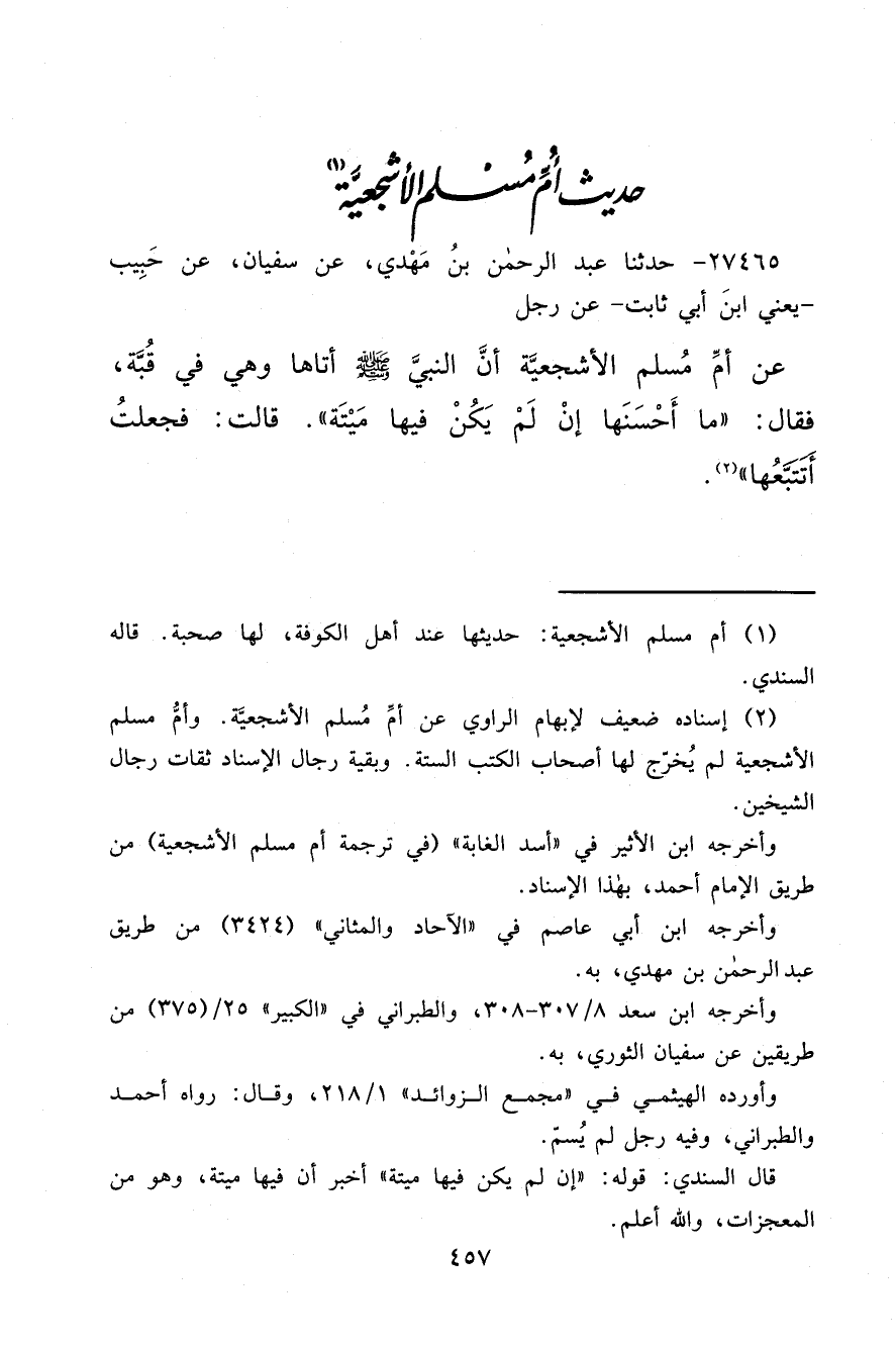 (٢) إسناده ضعيف لإبهام الراوي عن أمِّ مُسلم الأشجعيّه. وأمُّ مسلم الأشجعية لم يُخرّج لها أصحاب الكتب الستة. وبقية رجال الإسناد ثقات رجال الشيخين.