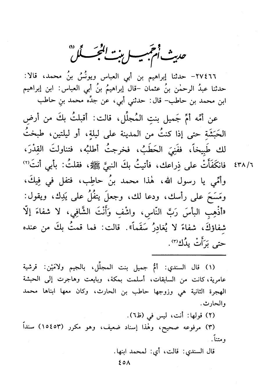 ٢٧٤٦٦ - حَدَّثَنَا إِبْرَاهِيمُ بْنُ أَبِي الْعَبَّاسِ، وَيُونُسُ بْنُ مُحَمَّدٍ، قَالَا: حَدَّثَنَا عَبْدُ الرَّحْمَنِ بْنُ عُثْمَانَ، قَالَ: إِبْرَاهِيمُ بْنُ أَبِي الْعَبَّاسِ ابْنَ إِبْرَاهِيمَ بْنِ مُحَمَّدِ بْنِ حَاطِبٍ، قَالَ: حَدَّثَنِي أَبِي، عَنْ جَدِّهِ مُحَمَّدِ بْنِ حَاطِبٍ، عَنْ أُمِّهِ أُمِّ جَمِيلٍ بِنْتِ الْمُجَلِّلِ، قَالَتْ: أَقْبَلْتُ بِكَ مِنْ أَرْضِ الْحَبَشَةِ حَتَّى إِذَا كُنْتُ مِنَ الْمَدِينَةِ عَلَى لَيْلَةٍ أَوْ لَيْلَتَيْنِ طَبَخْتُ لَكَ طَبِيخًا فَفَنِيَ الْحَطَبُ فَخَرَجْتُ أَطْلُبُهُ فَتَنَاوَلْتُ الْقِدْرَ فَانْكَفَأَتْ عَلَى ذِرَاعِكَ فَأَتَيْتُ بِكَ النَّبِيَّ صَلَّى اللهُ عَلَيْهِ وَسَلَّمَ فَقُلْتُ: بِأَبِي أَنْتَ (٢) وَأُمِّي يَا رَسُولَ اللهِ هَذَا مُحَمَّدُ بْنُ حَاطِبٍ فَتَفَلَ فِي فِيكَ وَمَسَحَ عَلَى رَأْسِكَ، وَدَعَا لَكَ وَجَعَلَ يَتْفُلُ عَلَى يَدِكَ وَيَقُولُ: " أَذْهِبِ الْبَأْسَ رَبَّ النَّاسِ، وَاشْفِ وَأَنْتَ الشَّافِي، لَا شِفَاءَ إِلَّا شِفَاؤُكَ، شِفَاءً لَا يُغَادِرُ سَقَمًا " قَالَتْ: فَمَا قُمْتُ بِكَ مِنْ عِنْدِهِ حَتَّى بَرَأَتْ يَدُكَ (٣)