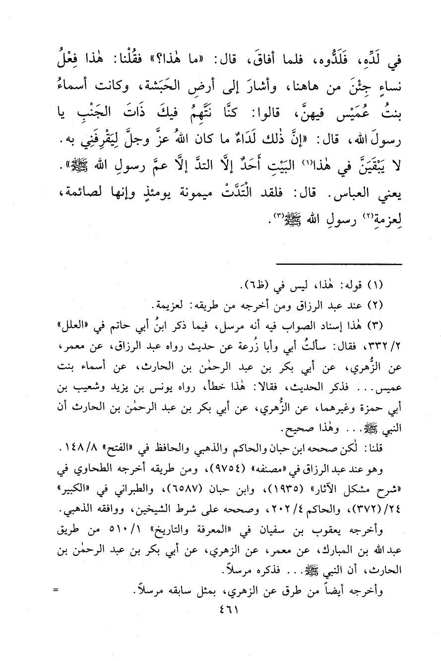 (٣) هذا إسناد الصواب فيه أنه مرسل، فيما ذكر ابنُ أبي حاتم في "العلل" ٢/٣٣٢، فقال: سألتُ أبي وأبا زُرعة عن حديث رواه عبد الرزاق، عن معمر، عن الزُّهري، عن أبي بكر بن عبد الرحمن بن الحارث، عن أسماء بنت عميس ... فذكر الحديث، فقالا: هذا خطأ، رواه يونس بن يزيد وشعيب بن أبي حمزة وغيرهما، عن الزُّهري، عن أبي بكر بن عبد الرحمن بن الحارث أن النبي صَلَّى اللهُ عَلَيْهِ وَسَلَّمَ ... وهذا صحيح.