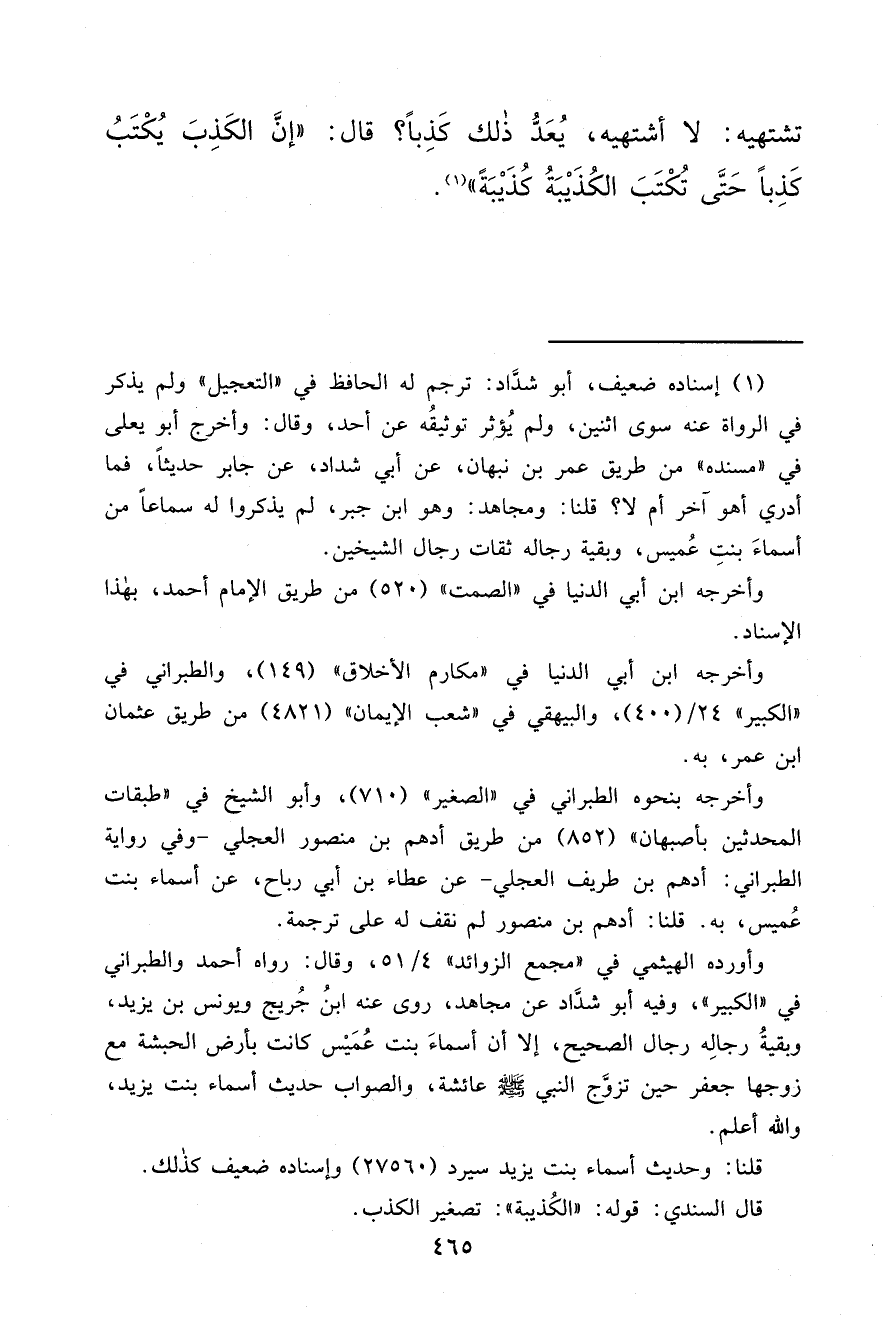 تَشْتَهِيهِ لَا أَشْتَهِيهِ يُعَدُّ ذَلِكَ كَذِبًا قَالَ: " إِنَّ الْكَذِبَ يُكْتَبُ كَذِبًا حَتَّى تُكْتَبَ الْكُذَيْبَةُ كُذَيْبَةً " (١)