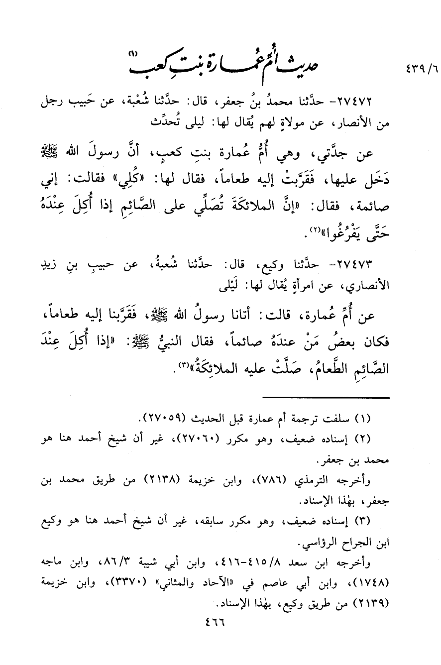 ٢٧٤٧٢ - حَدَّثَنَا مُحَمَّدُ بْنُ جَعْفَرٍ، قَالَ: حَدَّثَنَا شُعْبَةُ، عَنْ حَبِيبٍ رَجُلٍ مِنَ الْأَنْصَارِ عَنْ مَوْلَاةٍ لَهُمْ يُقَالُ لَهَا لَيْلَى تُحَدِّثُ عَنْ جَدَّتِي وَهِيَ أُمُّ عُمَارَةَ بِنْتُ كَعْبٍ أَنَّ رَسُولَ اللهِ صَلَّى اللهُ عَلَيْهِ وَسَلَّمَ دَخَلَ عَلَيْهَا فَقَرَّبَتْ إِلَيْهِ طَعَامًا فَقَالَ لَهَا: " كُلِي " فَقَالَتْ: إِنِّي صَائِمَةٌ، فَقَالَ: " إِنَّ الْمَلَائِكَةَ تُصَلِّي عَلَى الصَّائِمِ إِذَا أُكِلَ عِنْدَهُ حَتَّى يَفْرُغُوا " (٢)