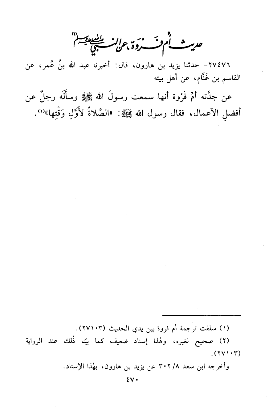 ٢٧٤٧٦ - حَدَّثَنَا يَزِيدُ بْنُ هَارُونَ، قَالَ: أَخْبَرَنَا عَبْدُ اللهِ بْنُ عُمَرَ، عَنِ الْقَاسِمِ بْنِ غَنَّامٍ، عَنْ أَهْلِ بَيْتِهِ، عَنْ جَدَّتِهِ أُمِّ فَرْوَةَ، أَنَّهَا سَمِعَتْ رَسُولَ اللهِ صَلَّى اللهُ عَلَيْهِ وَسَلَّمَ وَسَأَلَهُ رَجُلٌ عَنْ أَفْضَلِ الْأَعْمَالِ؟ فَقَالَ رَسُولُ اللهِ صَلَّى اللهُ عَلَيْهِ وَسَلَّمَ: " الصَّلَاةُ لِأَوَّلِ وَقْتِهَا " (٢)