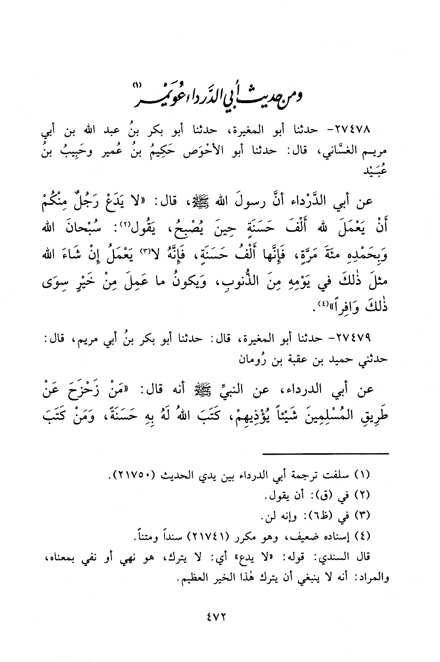 ٢٧٤٧٨ - حَدَّثَنَا أَبُو الْمُغِيرَةِ، حَدَّثَنَا أَبُو بَكْرِ بْنُ عَبْدِ اللهِ بْنِ أَبِي مَرْيَمَ الْغَسَّانِيُّ، قَالَ: حَدَّثَنَا أَبُو الْأَحْوَصِ حَكِيمُ بْنُ عُمَيْرٍ، وَحَبِيبُ بْنُ عُبَيْدٍ، عَنْ أَبِي الدَّرْدَاءِ أَنَّ رَسُولَ اللهِ صَلَّى اللهُ عَلَيْهِ وَسَلَّمَ قَالَ: " لَا يَدَعْ رَجُلٌ مِنْكُمْ أَنْ يَعْمَلَ لِلَّهِ أَلْفَ حَسَنَةٍ حِينَ يُصْبِحُ يَقُولُ (٢) : سُبْحَانَ اللهِ وَبِحَمْدِهِ مِائَةَ مَرَّةٍ، فَإِنَّهَا أَلْفُ حَسَنَةٍ، فَإِنَّهُ لَا (٣) يَعْمَلُ إِنْ شَاءَ اللهُ مِثْلَ ذَلِكَ فِي يَوْمِهِ مِنَ الذُّنُوبِ، وَيَكُونُ مَا عَمِلَ مِنْ خَيْرٍ سِوَى ذَلِكَ وَافِرًا " (٤)