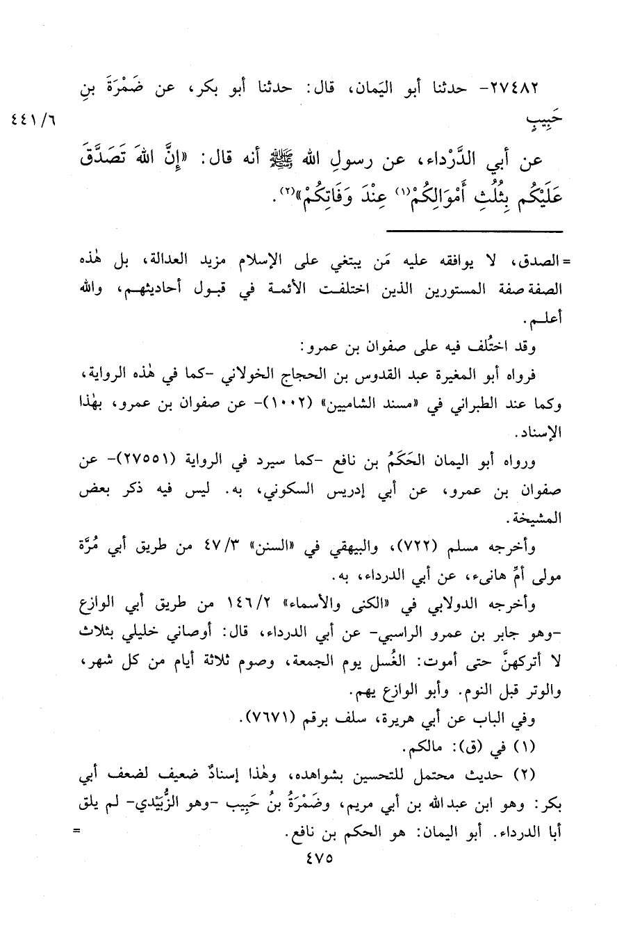 ٢٧٤٨٢ - حَدَّثَنَا أَبُو الْيَمَانِ، قَالَ: حَدَّثَنَا أَبُو بَكْرٍ، عَنْ ضَمْرَةَ بْنِ حَبِيبٍ، عَنْ أَبِي الدَّرْدَاءِ، عَنْ رَسُولِ اللهِ صَلَّى اللهُ عَلَيْهِ وَسَلَّمَ أَنَّهُ قَالَ: " إِنَّ اللهَ تَصَدَّقَ عَلَيْكُمْ بِثُلُثِ أَمْوَالِكُمْ (١) عِنْدَ وَفَاتِكُمْ " (٢)