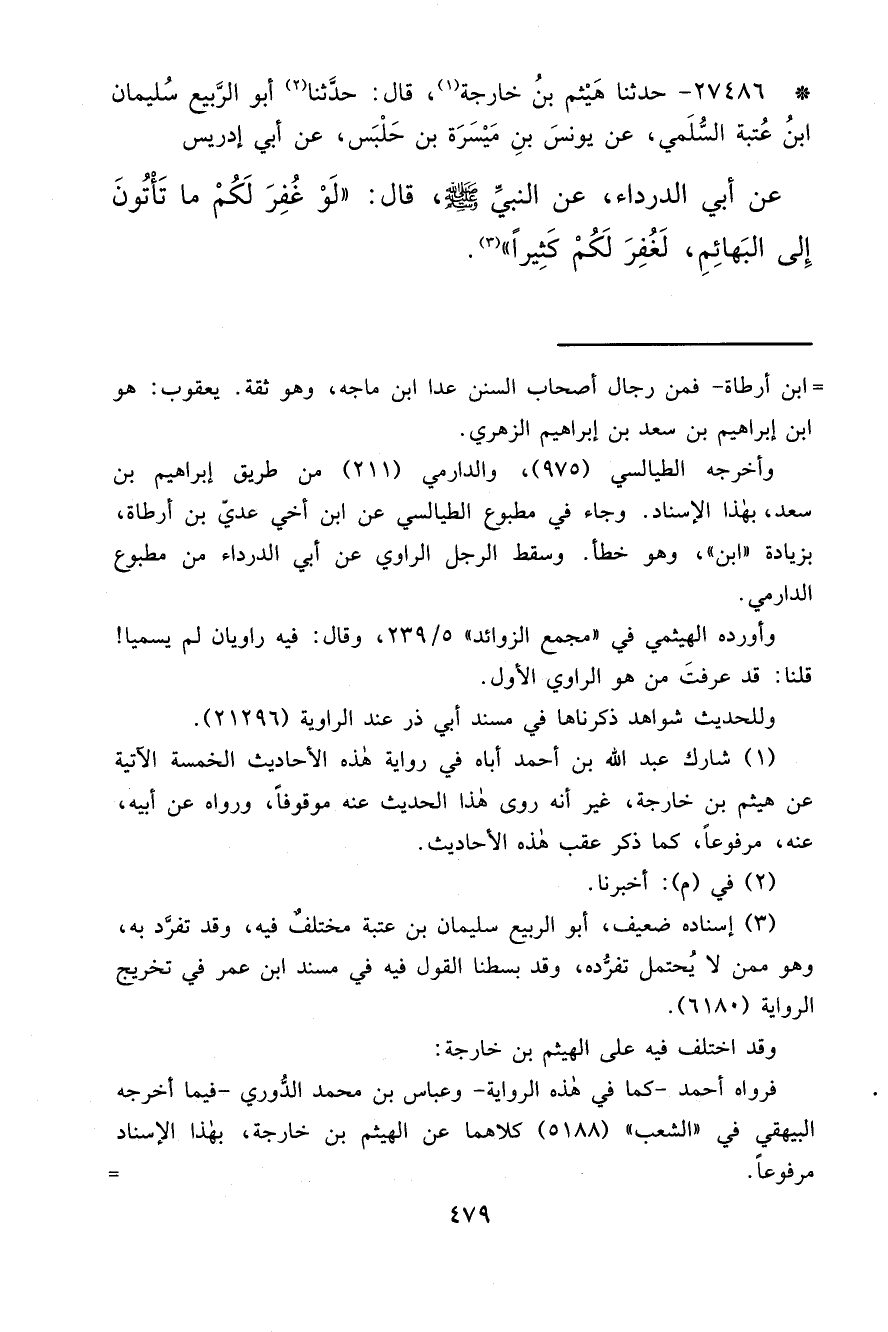 * ٢٧٤٨٦ - حَدَّثَنَا هَيْثَمُ بْنُ خَارِجَةَ (١) ، قَالَ: حَدَّثَنَا (٢) أَبُو الرَّبِيعِ سُلَيْمَانُ بْنُ عُتْبَةَ السُّلَمِيُّ، عَنْ يُونُسَ بْنِ مَيْسَرَةَ بْنِ حَلْبَسٍ، عَنْ أَبِي إِدْرِيسَ، عَنْ أَبِي الدَّرْدَاءِ، عَنِ النَّبِيِّ صَلَّى اللهُ عَلَيْهِ وَسَلَّمَ قَالَ: " لَوْ غُفِرَ لَكُمْ مَا تَأْتُونَ إِلَى الْبَهَائِمِ لَغُفِرَ لَكُمْ كَثِيرًا " (٣)