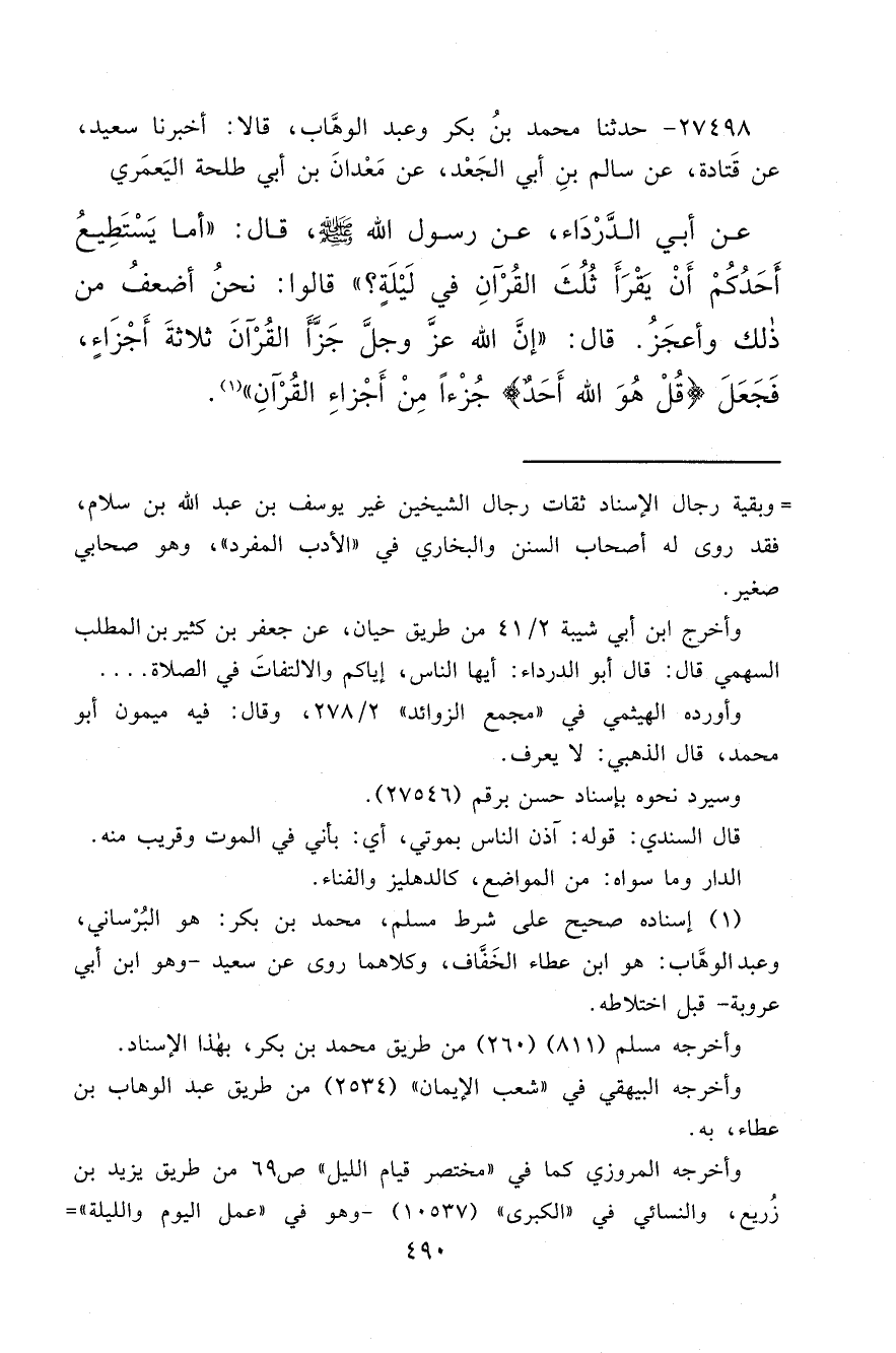 ٢٧٤٩٨ - حَدَّثَنَا مُحَمَّدُ بْنُ بَكْرٍ، وَعَبْدُ الْوَهَّابِ، قَالَا: أَخْبَرَنَا سَعِيدٌ، عَنْ قَتَادَةَ، عَنْ سَالِمِ بْنِ أَبِي الْجَعْدِ، عَنْ مَعْدَانَ بْنِ أَبِي طَلْحَةَ الْيَعْمُرِيِّ، عَنْ أَبِي الدَّرْدَاءِ، عَنْ رَسُولِ اللهِ صَلَّى اللهُ عَلَيْهِ وَسَلَّمَ قَالَ: " أَمَا يَسْتَطِيعُ أَحَدُكُمْ أَنْ يَقْرَأَ ثُلُثَ الْقُرْآنِ فِي لَيْلَةٍ؟ " قَالُوا: نَحْنُ أَضْعَفُ مِنْ ذَلِكَ وَأَعْجَزُ قَالَ: " إِنَّ اللهَ عَزَّ وَجَلَّ جَزَّأَ الْقُرْآنَ ثَلَاثَةَ أَجْزَاءٍ، فَجَعَلَ قُلْ هُوَ اللهُ أَحَدٌ جُزْءًا مِنْ أَجْزَاءِ الْقُرْآنِ " (١)