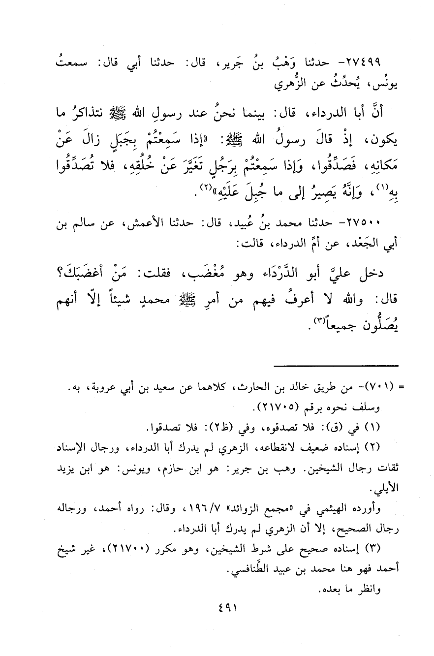 (٢) إسناده ضعيف لانقطاعه، الزهري لم يدرك أبا الدرداء، ورجال الإسناد ثقات رجال الشيخين. وهب بن جرير: هو ابن حازم، ويونس: هو ابن يزيد الأيلي.