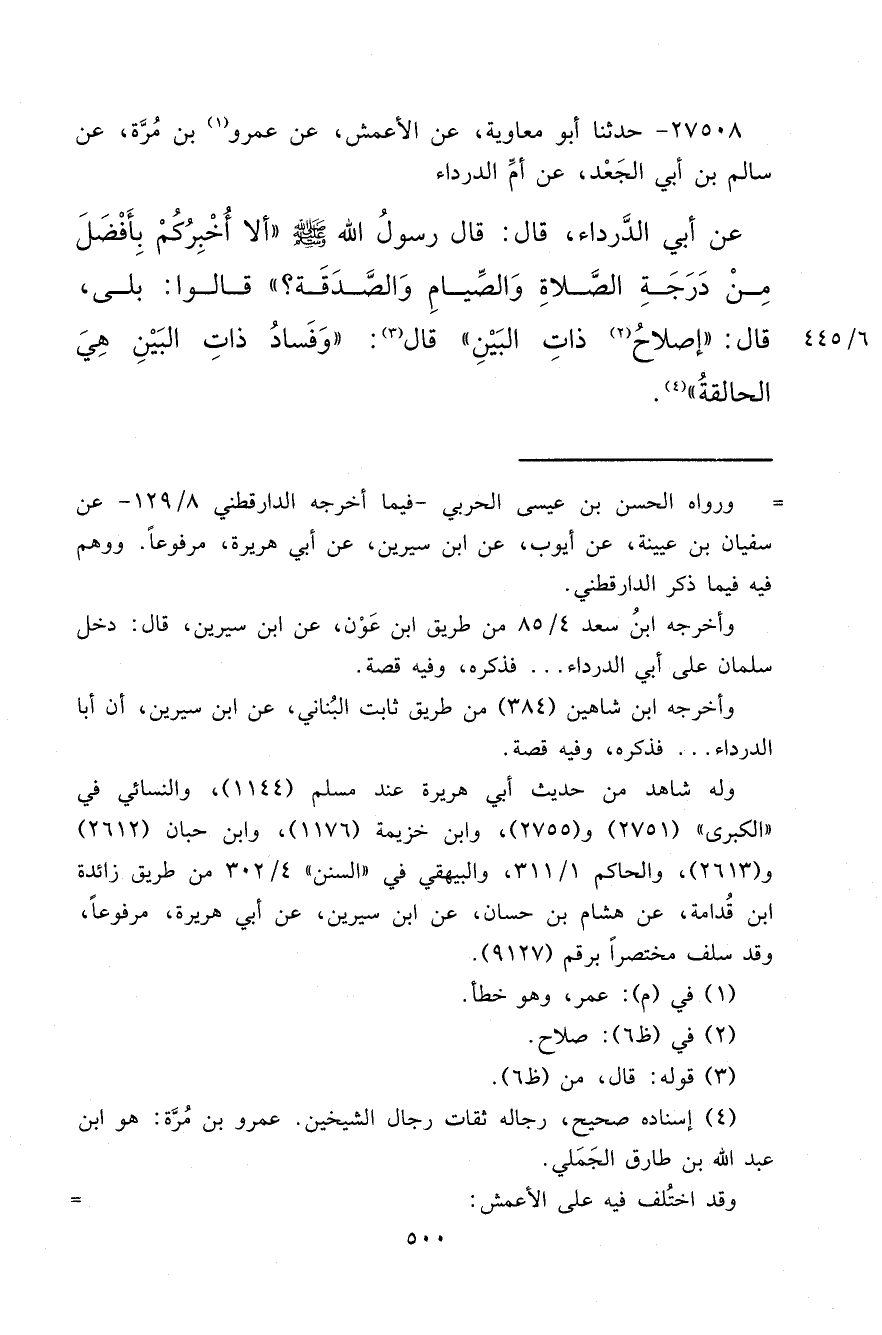 ٢٧٥٠٨ - حَدَّثَنَا أَبُو مُعَاوِيَةَ، عَنِ الْأَعْمَشِ، عَنْ عَمْرِو (١) بْنِ مُرَّةَ، عَنْ سَالِمِ بْنِ أَبِي الْجَعْدِ، عَنْ أُمِّ الدَّرْدَاءِ، عَنْ أَبِي الدَّرْدَاءِ، قَالَ: قَالَ رَسُولُ اللهِ صَلَّى اللهُ عَلَيْهِ وَسَلَّمَ: " أَلَا أُخْبِرُكُمْ بِأَفْضَلَ مِنْ دَرَجَةِ الصَّلَاةِ، وَالصِّيَامِ، وَالصَّدَقَةِ؟ " قَالُوا: بَلَى قَالَ: " إِصْلَاحُ (٢) ذَاتِ الْبَيْنِ قَالَ (٣) : وَفَسَادُ ذَاتِ الْبَيْنِ هِيَ الْحَالِقَةُ " (٤)