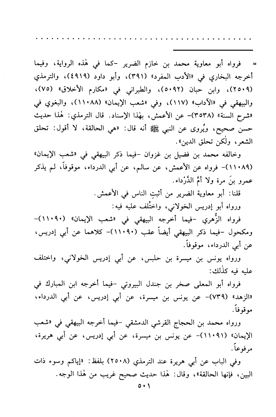 = فرواه أبو معاوية محمد بن خازم الضرير -كما في هذه الرواية، وفيما أخرجه البخاري في "الأدب المفرد" (٣٩١) ، وأبو داود (٤٩١٩) ، والترمذي (٢٥٠٩) ، وابن حبان (٥٠٩٢) ، والطبراني في "مكارم الأخلاق" (٧٥) ، والبيهقي في "الآداب" (١١٧) ، وفي "شعب الإيمان" (١١٠٨٨) ، والبغوي في "شرح السنة" (٣٥٣٨) - عن الأعمش، بهذا الإسناد. قال الترمذي: هذا حديث حسن صحيح، ويُروى عن النبي صَلَّى اللهُ عَلَيْهِ وَسَلَّمَ أنه قال: "هي الحالقة، لا أقول: تحلق الشعر، ولكن تحلق الدين".