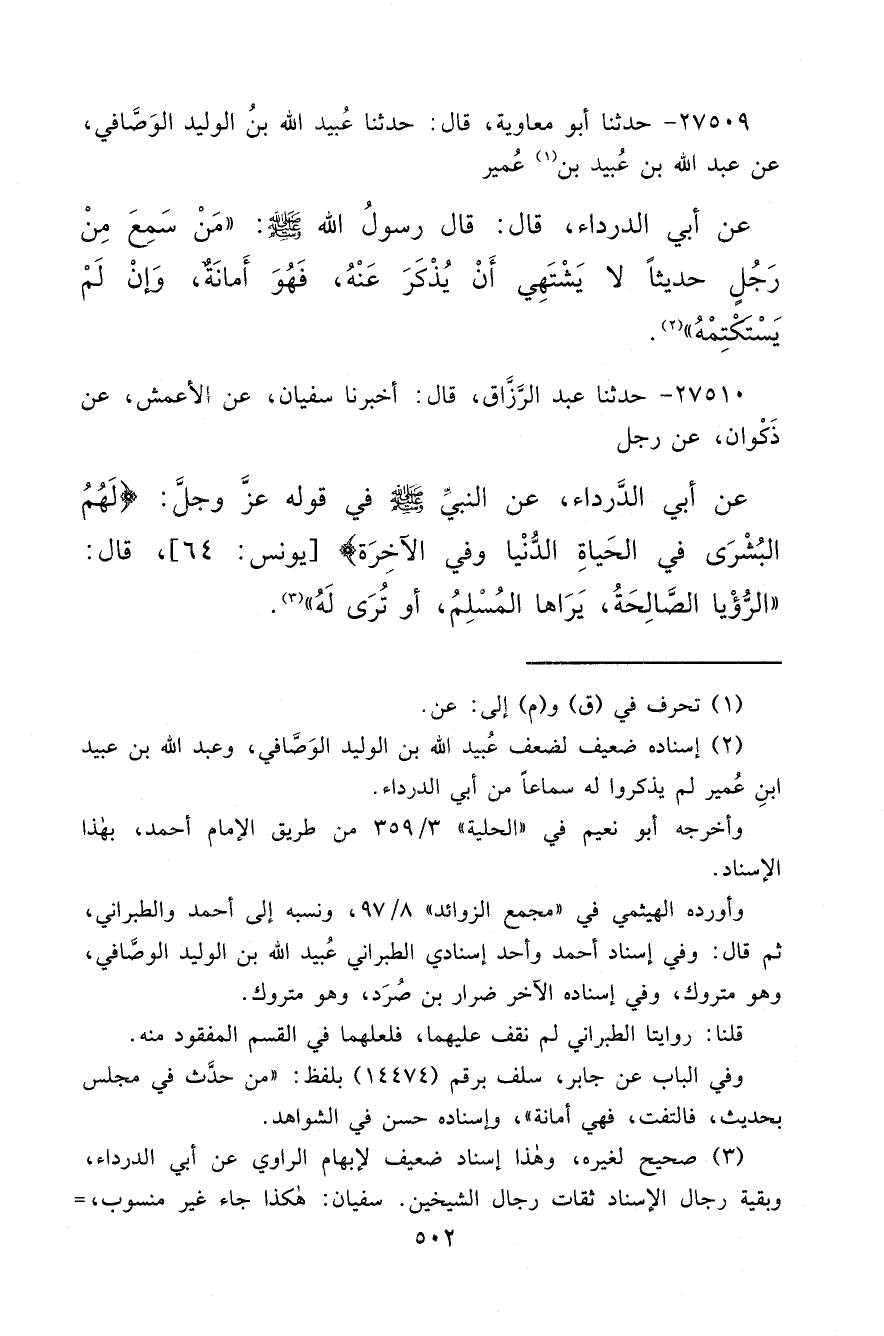 ٢٧٥٠٩ - حَدَّثَنَا أَبُو مُعَاوِيَةَ، قَالَ: حَدَّثَنَا عُبَيْدُ اللهِ بْنُ الْوَلِيدِ الْوَصَّافِيُّ، عَنْ عَبْدِ اللهِ بْنِ عُبَيْدِ بْنِ (١) عُمَيْرٍ، عَنْ أَبِي الدَّرْدَاءِ، قَالَ: قَالَ رَسُولُ اللهِ صَلَّى اللهُ عَلَيْهِ وَسَلَّمَ: " مَنْ سَمِعَ مِنْ رَجُلٍ حَدِيثًا، لَا يَشْتَهِي أَنْ يُذْكَرَ عَنْهُ، فَهُوَ أَمَانَةٌ، وَإِنْ لَمْ يَسْتَكْتِمْهُ " (٢)