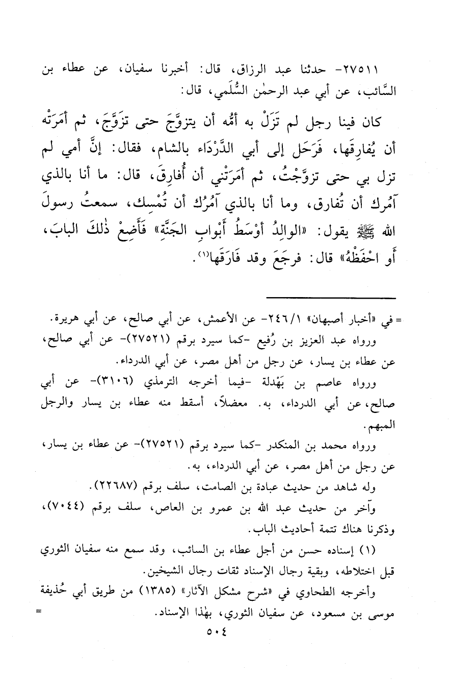٢٧٥١١ - حَدَّثَنَا عَبْدُ الرَّزَّاقِ، قَالَ: أَخْبَرَنَا سُفْيَانُ، عَنْ عَطَاءِ بْنِ السَّائِبِ، عَنْ أَبِي عَبْدِ الرَّحْمَنِ السُّلَمِيِّ، قَالَ: كَانَ فِينَا رَجُلٌ لَمْ تَزَلْ بِهِ أُمُّهُ أَنْ يَتَزَوَّجَ حَتَّى تَزَوَّجَ، ثُمَّ أَمَرَتْهُ أَنْ يُفَارِقَهَا، فَرَحَلَ إِلَى أَبِي الدَّرْدَاءِ بِالشَّامِ، فَقَالَ: إِنَّ أُمِّي لَمْ تَزَلْ بِي حَتَّى تَزَوَّجْتُ، ثُمَّ أَمَرَتْنِي أَنْ أُفَارِقَ قَالَ: مَا أَنَا بِالَّذِي آمُرُكَ أَنْ تُفَارِقَ، وَمَا أَنَا بِالَّذِي آمُرُكَ أَنْ تُمْسِكَ سَمِعْتُ رَسُولَ اللهِ صَلَّى اللهُ عَلَيْهِ وَسَلَّمَ يَقُولُ: " الْوَالِدُ أَوْسَطُ أَبْوَابِ الْجَنَّةِ " فَأَضِعْ ذَلِكَ الْبَابَ، أَوْ احْفَظْهُ قَالَ: فَرَجَعَ وَقَدْ فَارَقَهَا (١)