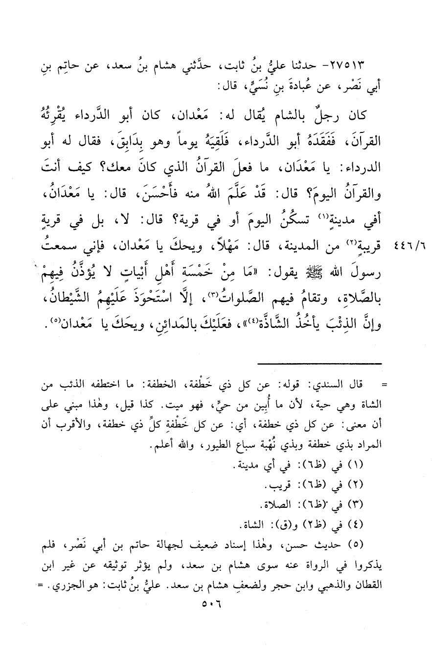 ٢٧٥١٣ - حَدَّثَنَا عَلِيُّ بْنُ ثَابِتٍ، حَدَّثَنِي هِشَامُ بْنُ سَعْدٍ، عَنْ حَاتِمِ بْنِ أَبِي نَصْرٍ، عَنْ عُبَادَةَ بْنِ نُسَيٍّ، قَالَ: كَانَ رَجُلٌ بِالشَّامِ يُقَالُ لَهُ: مَعْدَانُ، كَانَ أَبُو الدَّرْدَاءِ يُقْرِئُهُ الْقُرْآنَ، فَفَقَدَهُ أَبُو الدَّرْدَاءَ، فَلَقِيَهُ يَوْمًا وَهُوَ بِدَابِقٍ، فَقَالَ لَهُ أَبُو الدَّرْدَاءِ: يَا مَعْدَانُ مَا فَعَلَ الْقُرْآنُ الَّذِي كَانَ مَعَكَ؟ كَيْفَ أَنْتَ وَالْقُرْآنُ الْيَوْمَ؟ قَالَ: قَدْ عَلِمَ اللهُ مِنْهُ فَأَحْسَنَ، قَالَ: يَا مَعْدَانُ، أَفِي مَدِينَةٍ (١) تَسْكُنُ الْيَوْمَ أَوْ فِي قَرْيَةٍ؟ قَالَ: لَا، بَلْ فِي قَرْيَةٍ قَرِيبَةٍ (٢) مِنَ الْمَدِينَةِ، قَالَ: مَهْلًا، وَيْحَكَ يَا مَعْدَانُ، فَإِنِّي سَمِعْتُ رَسُولَ اللهِ صَلَّى اللهُ عَلَيْهِ وَسَلَّمَ يَقُولُ: " مَا مِنْ خَمْسَةِ أَهْلِ أَبْيَاتٍ لَا يُؤَذَّنُ فِيهِمْ بِالصَّلَاةِ، وَتُقَامُ فِيهِمُ الصَّلَوَاتُ (٣) ، إِلَّا اسْتَحْوَذَ عَلَيْهِمُ الشَّيْطَانُ، وَإِنَّ الذِّئْبَ يَأْخُذُ الشَّاذَّةَ (٤) " فَعَلَيْكَ بِالْمَدَائِنِ، وَيْحَكَ يَا مَعْدَانُ (٥)