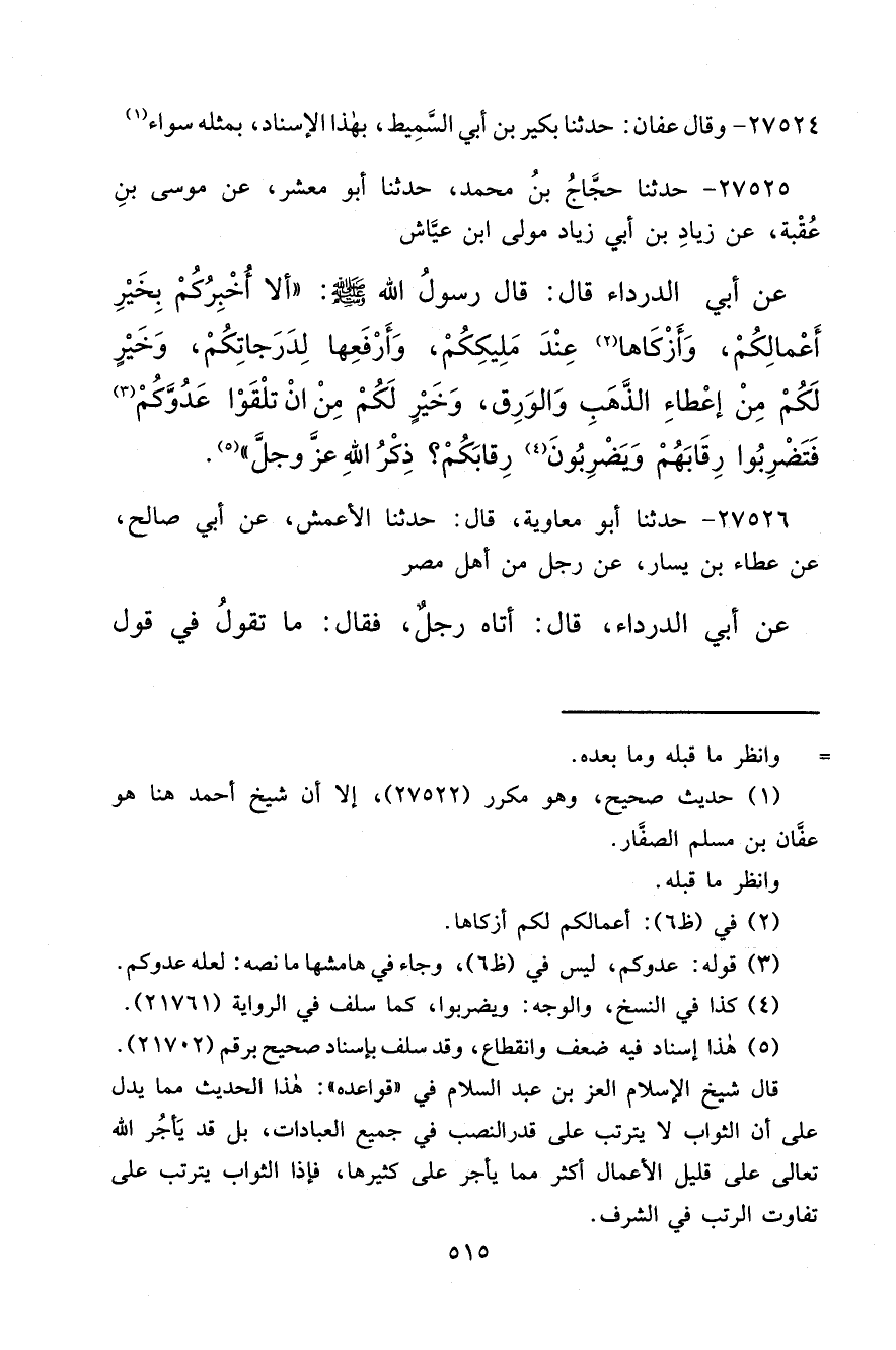 ٢٧٥٢٥ - حَدَّثَنَا حَجَّاجُ بْنُ مُحَمَّدٍ، حَدَّثَنَا أَبُو مَعْشَرٍ، عَنْ مُوسَى بْنِ عُقْبَةَ، عَنْ زِيَادِ بْنِ أَبِي زِيَادٍ، مَوْلَى ابْنِ عَيَّاشٍ، عَنْ أَبِي الدَّرْدَاءِ، قَالَ: قَالَ رَسُولُ اللهِ صَلَّى اللهُ عَلَيْهِ وَسَلَّمَ: " أَلَا أُخْبِرُكُمْ بِخَيْرِ أَعْمَالِكُمْ، وَأَزْكَاهَا (٢) عِنْدَ مَلِيكِكُمْ، وَأَرْفَعِهَا لِدَرَجَاتِكُمْ، وَخَيْرٍ لَكُمْ مِنْ إِعْطَاءِ الذَّهَبِ وَالْوَرِقِ، وَخَيْرٍ لَكُمْ مِنْ أَنْ تَلْقَوْا عَدُوَّكُمْ (٣) فَتَضْرِبُوا رِقَابَهُمْ وَيَضْرِبُونَ (٤) رِقَابَكُمْ؟ ذِكْرُ اللهِ عَزَّ وَجَلَّ " (٥)