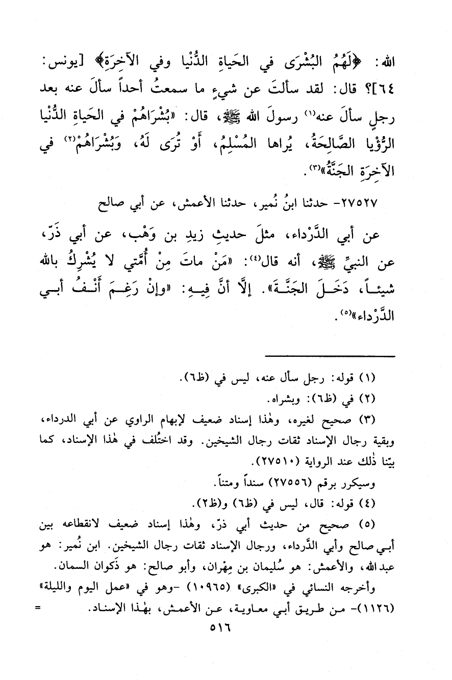 (٥) صحيح من حديث أبي ذرّ، وهذا إسناد ضعيف لانقطاعه بين أبي صالح وأبي الدَّرداء، ورجال الإسناد ثقات رجال الشيخين. ابن نُمير: هو عبد الله، والأعمش: هو سُليمان بن مِهْران، وأبو صالح: هو ذَكوان السمان.