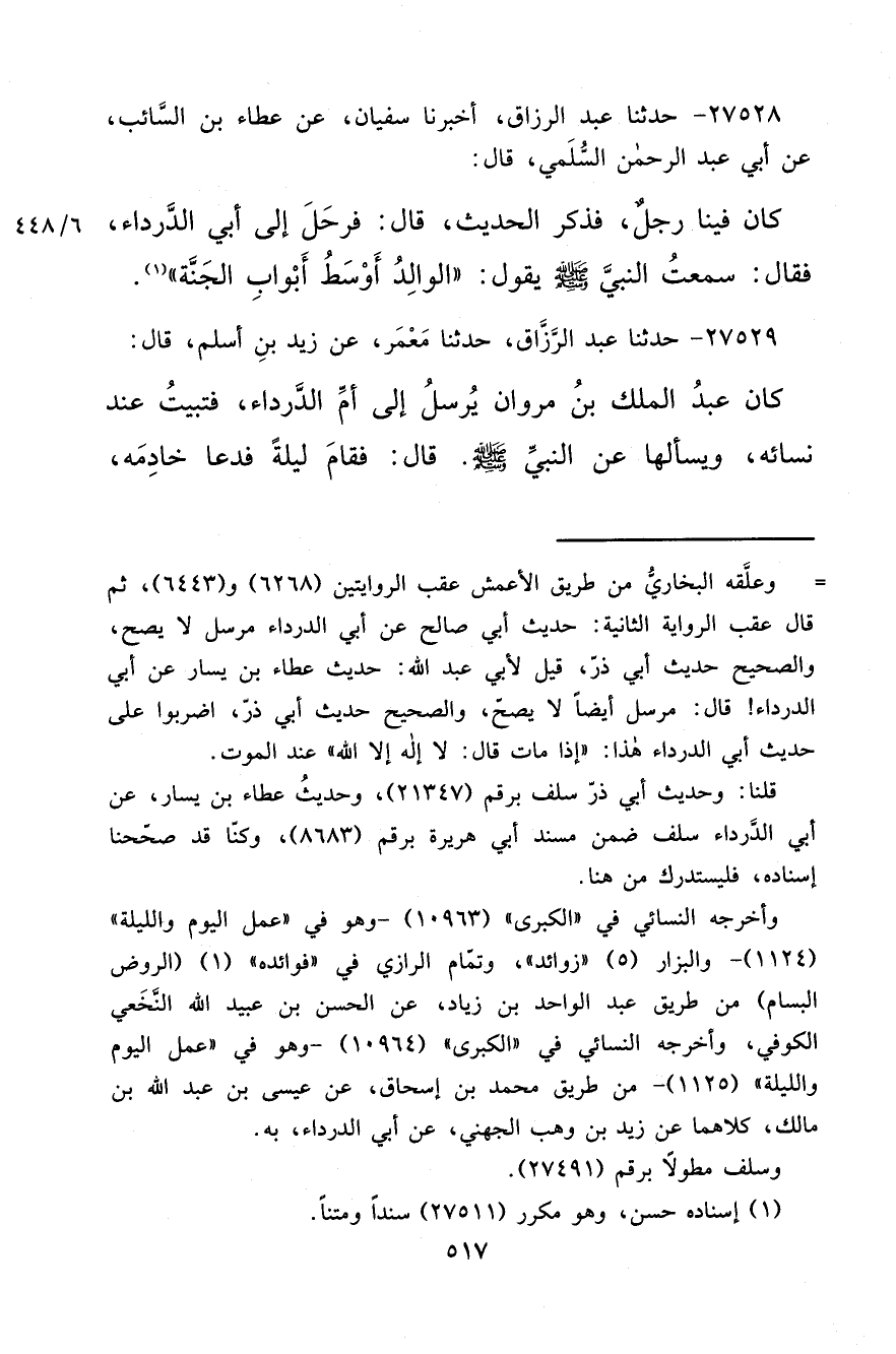 ٢٧٥٢٨ - حَدَّثَنَا عَبْدُ الرَّزَّاقِ، أَخْبَرَنَا سُفْيَانُ، عَنْ عَطَاءِ بْنِ السَّائِبِ، عَنْ أَبِي عَبْدِ الرَّحْمَنِ السُّلَمِيِّ، قَالَ: كَانَ فِينَا رَجُلٌ فَذَكَرَ الْحَدِيثَ قَالَ: فَرَحَلَ إِلَى أَبِي الدَّرْدَاءِ، فَقَالَ سَمِعْتُ النَّبِيَّ صَلَّى اللهُ عَلَيْهِ وَسَلَّمَ يَقُولُ: " الْوَالِدُ أَوْسَطُ أَبْوَابِ الْجَنَّةِ " (١)