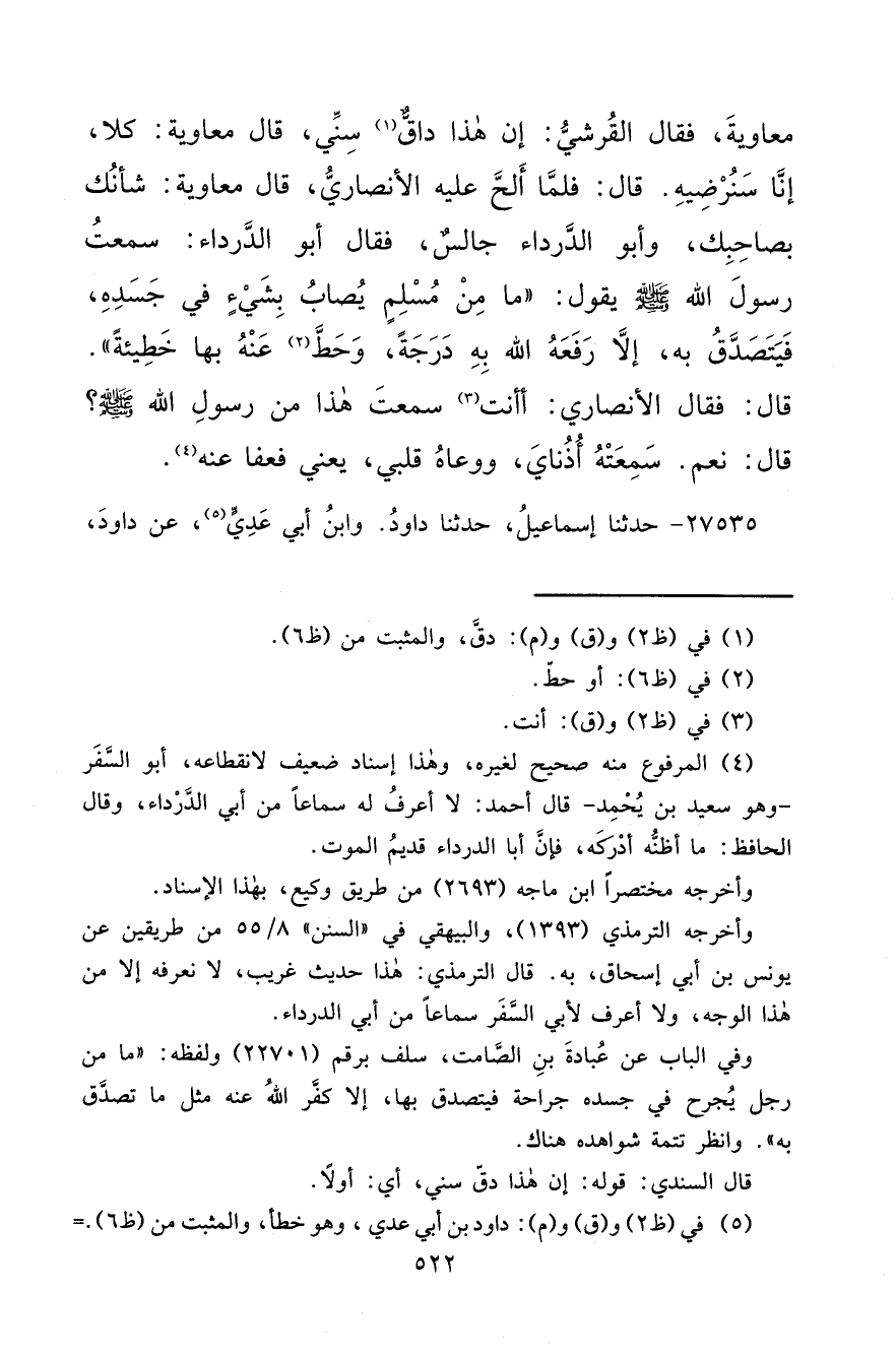 مُعَاوِيَةَ، فَقَالَ الْقُرَشِيُّ: إِنَّ هَذَا داَقٌّ (١) سِنِّي، قَالَ مُعَاوِيَةُ: كَلَّا إِنَّا سَنُرْضِيهِ، قَالَ: فَلَمَّا أَلَحَّ عَلَيْهِ الْأَنْصَارِيُّ، قَالَ مُعَاوِيَةُ: شَأْنَكَ بِصَاحِبِكَ، وَأَبُو الدَّرْدَاءِ جَالِسٌ، فَقَالَ أَبُو الدَّرْدَاءِ: سَمِعْتُ رَسُولَ اللهِ صَلَّى اللهُ عَلَيْهِ وَسَلَّمَ يَقُولُ: " مَا مِنْ مُسْلِمٍ يُصَابُ بِشَيْءٍ فِي جَسَدِهِ، فَيَتَصَدَّقُ بِهِ، إِلَّا رَفَعَهُ اللهُ بِهِ دَرَجَةً، وَحَطَّ (٢) عَنْهُ بِهَا خَطِيئَةً " قَالَ: فَقَالَ الْأَنْصَارِيُّ: أَأَنْتَ (٣) سَمِعْتَ هَذَا مِنْ رَسُولِ اللهِ صَلَّى اللهُ عَلَيْهِ وَسَلَّمَ؟ قَالَ: نَعَمْ، سَمِعَتْهُ أُذُنَايَ، وَوَعَاهُ قَلْبِي، يَعْنِي فَعَفَا عَنْهُ، (٤)