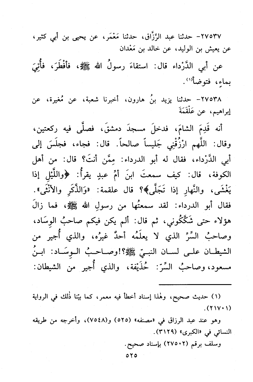 ٢٧٥٣٨ - حَدَّثَنَا يَزِيدُ بْنُ هَارُونَ، أَخْبَرَنَا شُعْبَةُ، عَنْ مُغِيرَةَ، عَنْ إِبْرَاهِيمَ، عَنْ عَلْقَمَةَ، أَنَّهُ قَدِمَ الشَّامَ فَدَخَلَ مَسْجِدَ دِمَشْقَ فَصَلَّى فِيهِ رَكْعَتَيْنِ وَقَالَ: اللهُمَّ ارْزُقْنِي جَلِيسًا صَالِحًا قَالَ: فَجَاءَ فَجَلَسَ إِلَى أَبِي الدَّرْدَاءِ فَقَالَ لَهُ أَبُو الدَّرْدَاءِ: مِمَّنْ أَنْتَ؟ قَالَ: مِنْ أَهْلِ الْكُوفَةِ قَالَ: كَيْفَ سَمِعْتَ ابْنَ أُمِّ عَبْدٍ يَقْرَأُ: وَاللَّيْلِ إِذَا يَغْشَى وَالنَّهَارِ إِذَا تَجَلَّى؟ قَالَ عَلْقَمَةُ: " وَالذَّكَرِ وَالْأُنْثَى " فَقَالَ أَبُو الدَّرْدَاءِ: " لَقَدْ سَمِعْتُهَا مِنْ رَسُولِ اللهِ صَلَّى اللهُ عَلَيْهِ وَسَلَّمَ فَمَا زَالَ هَؤُلَاءِ حَتَّى شَكَّكُونِي " ثُمَّ قَالَ: أَلَمْ يَكُنْ فِيكُمْ صَاحِبُ الْوِسَادِ، وَصَاحِبُ السِّرِّ الَّذِي لَا يَعْلَمُهُ أَحَدٌ غَيْرُهُ، وَالَّذِي أُجِيرَ مِنَ الشَّيْطَانِ عَلَى لِسَانِ النَّبِيِّ صَلَّى اللهُ عَلَيْهِ وَسَلَّمَ؟ وَصَاحِبُ الْوِسَادِ: ابْنُ مَسْعُودٍ، وَصَاحِبُ السِّرِّ حُذَيْفَةُ، وَالَّذِي أُجِيرَ مِنَ الشَّيْطَانِ