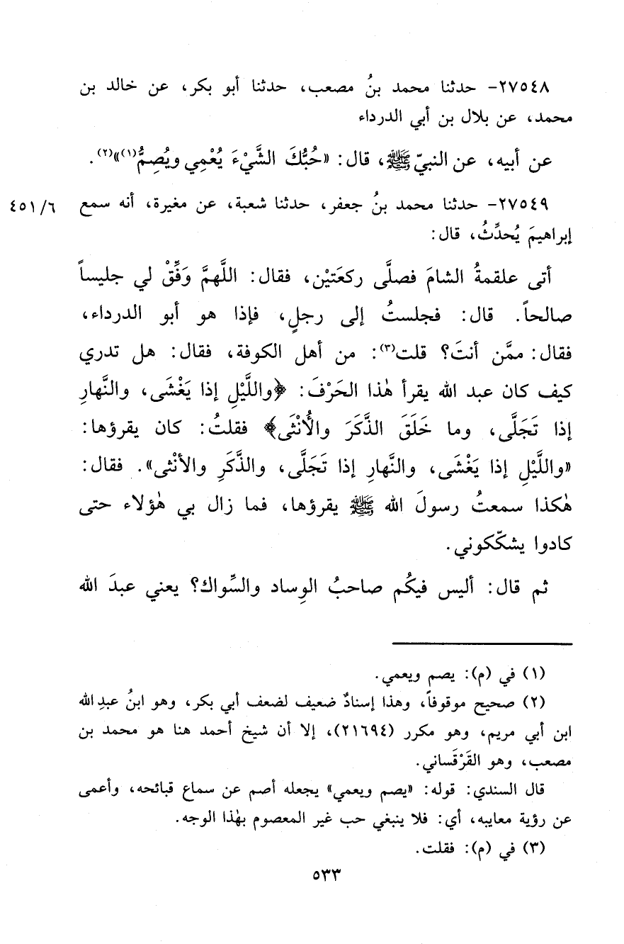 ٢٧٥٤٩ - حَدَّثَنَا مُحَمَّدُ بْنُ جَعْفَرٍ، حَدَّثَنَا شُعْبَةُ، عَنْ مُغِيرَةَ، أَنَّهُ سَمِعَ إِبْرَاهِيمَ، يُحَدِّثُ قَالَ: أَتَى عَلْقَمَةُ الشَّامَ فَصَلَّى رَكْعَتَيْنِ فَقَالَ: اللهُمَّ وَفِّقْ لِي جَلِيسًا صَالِحًا قَالَ: فَجَلَسْتُ إِلَى رَجُلٍ فَإِذَا هُوَ أَبُو الدَّرْدَاءِ فَقَالَ: مِمَّنْ أَنْتَ؟ قُلْتُ (٣) : مِنْ أَهْلِ الْكُوفَةِ فَقَالَ: هَلْ تَدْرِي كَيْفَ كَانَ عَبْدُ اللهِ يَقْرَأُ هَذَا الْحَرْفَ؟ " {وَاللَّيْلِ إِذَا يَغْشَى وَالنَّهَارِ إِذَا تَجَلَّى وَمَا خَلَقَ الذَّكَرَ وَالْأُنْثَى} [الليل: ٢] فَقُلْتُ: كَانَ يَقْرَؤُهَا " وَاللَّيْلِ إِذَا يَغْشَى وَالنَّهَارِ إِذَا تَجَلَّى وَالذَّكَرِ وَالْأُنْثَى " فَقَالَ: " هَكَذَا سَمِعْتُ رَسُولَ اللهِ صَلَّى اللهُ عَلَيْهِ وَسَلَّمَ يَقْرَؤُهَا " فَمَا زَالَ بِي هَؤُلَاءِ حَتَّى كَادُوا يُشَكِّكُونِي " ثُمَّ قَالَ: أَلَيْسَ فِيكُمْ صَاحِبُ الْوِسَادِ وَالسِّوَاكِ يَعْنِي عَبْدَ اللهِ