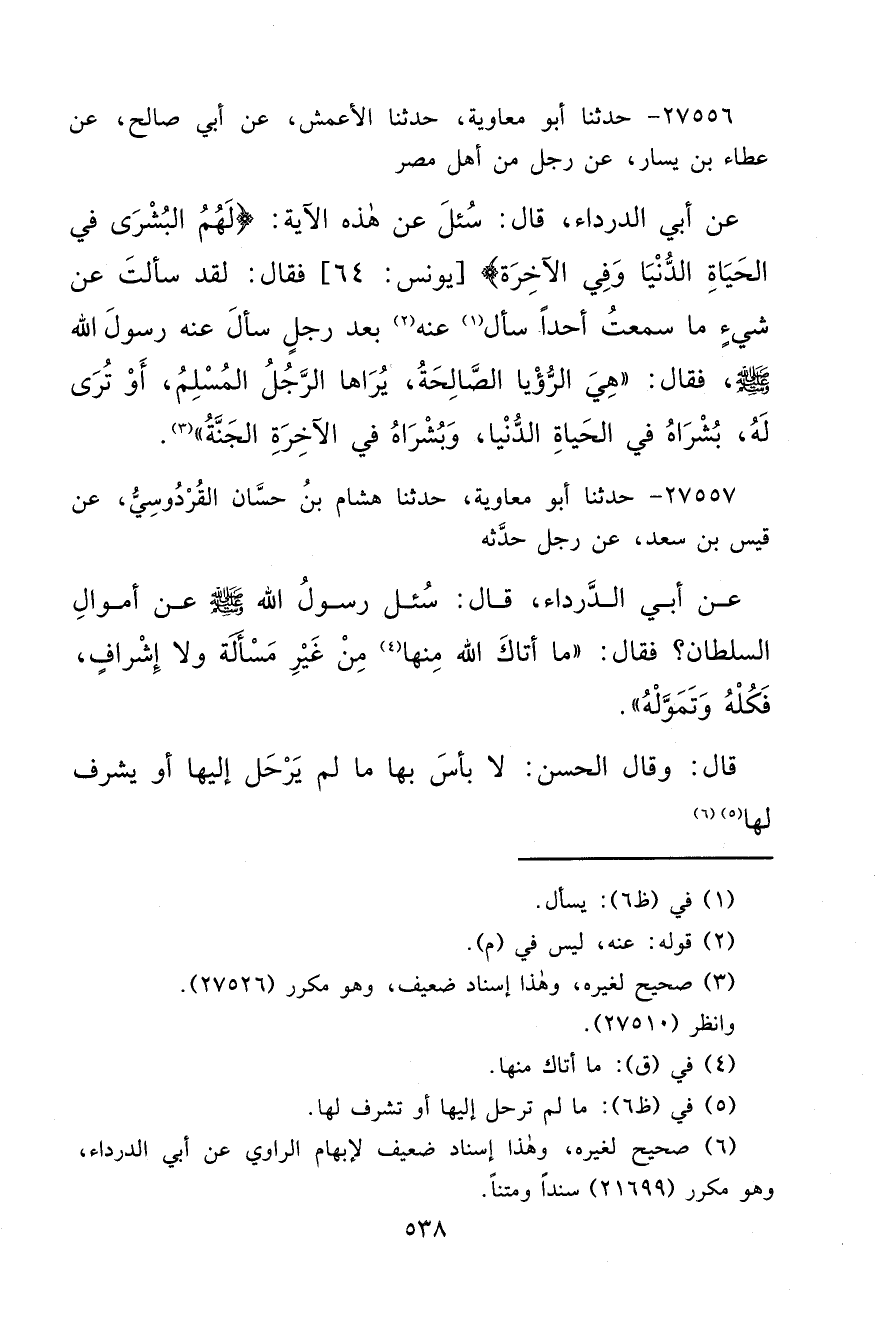 ٢٧٥٥٧ - حَدَّثَنَا أَبُو مُعَاوِيَةَ، حَدَّثَنَا هِشَامُ بْنُ حَسَّانَ الْقُرْدُوسِيُّ، عَنْ قَيْسِ بْنِ سَعْدٍ، عَنْ رَجُلٍ، حَدَّثَهُ عَنْ أَبِي الدَّرْدَاءِ قَالَ: سُئِلَ رَسُولُ اللهِ صَلَّى اللهُ عَلَيْهِ وَسَلَّمَ عَنْ أَمْوَالِ السُّلْطَانِ؟ فَقَالَ: " مَا أَتَاكَ اللهُ مِنْهَا (٤) مِنْ غَيْرِ مَسْأَلَةٍ، وَلَا إِشْرَافٍ فَكُلْهُ، وَتَمَوَّلْهُ " قَالَ: وقَالَ الْحَسَنُ: " لَا بَأْسَ بِهَا مَا لَمْ يَرْحَلْ إِلَيْهَا أَوْ يُشْرِفْ لَهَا " (٥) (٦)