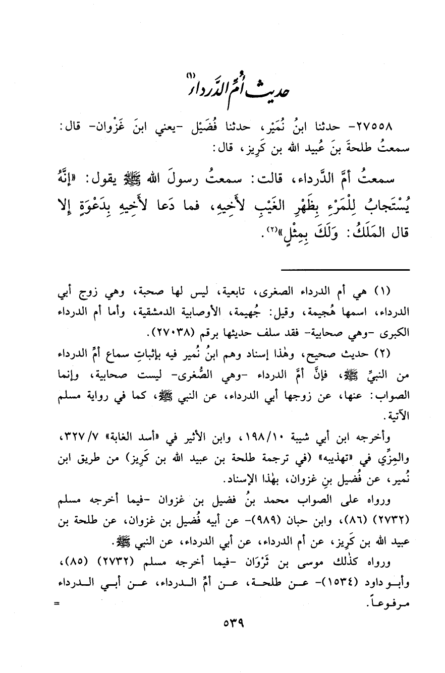 ٢٧٥٥٨ - حَدَّثَنَا ابْنُ نُمَيْرٍ، حَدَّثَنَا فُضَيْلٌ يَعْنِي ابْنَ غَزْوَانَ، قَالَ: سَمِعْتُ طَلْحَةَ بْنَ عُبَيْدِ اللهِ بْنِ كَرِيزٍ، قَالَ: سَمِعْتُ أُمَّ الدَّرْدَاءِ، قَالَتْ: سَمِعْتُ رَسُولَ اللهِ صَلَّى اللهُ عَلَيْهِ وَسَلَّمَ يَقُولُ: " إِنَّهُ يُسْتَجَابُ لِلْمَرْءِ بِظَهْرِ الْغَيْبِ لِأَخِيهِ فَمَا دَعَا لِأَخِيهِ بِدَعْوَةٍ، إِلَّا قَالَ: الْمَلَكُ وَلَكَ بِمِثْلٍ " (٢)